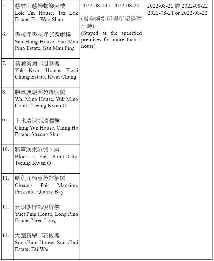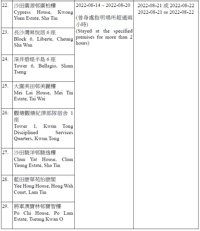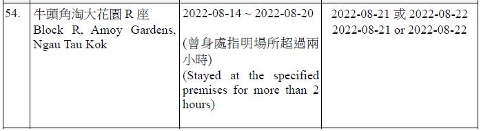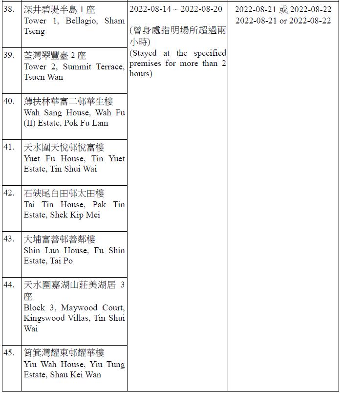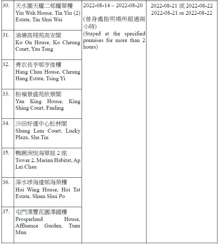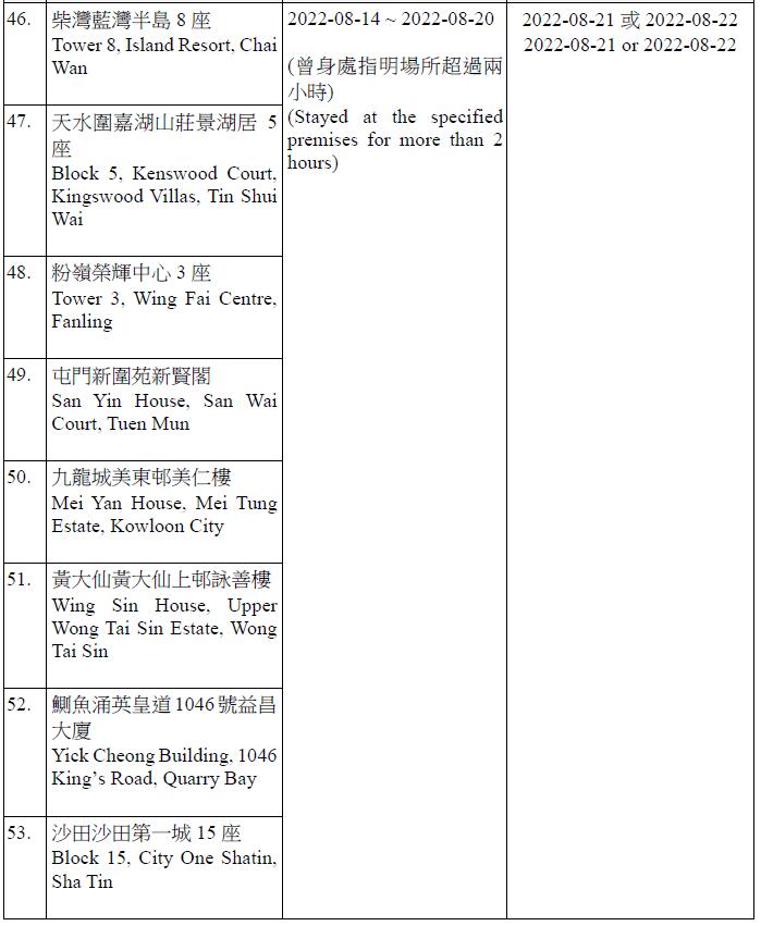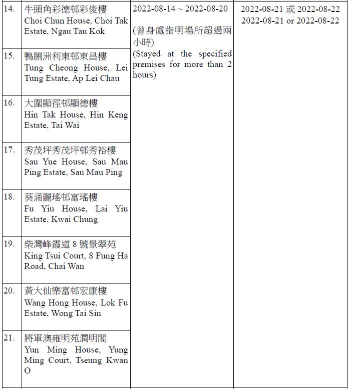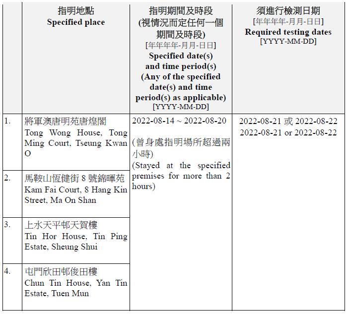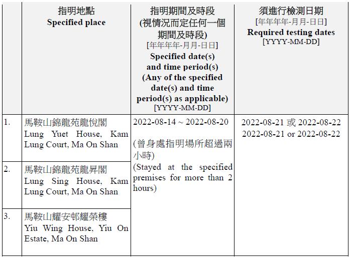 因應多宗陽性檢測個案,及在馬鞍山採集到檢測呈陽性的污水樣本,港府今晚(20日)就《規例》下的強制檢測公告刊憲,要求於指定期間曾身處57個指明地方的人士,須於8月21日及22日接受核酸檢測,包括將軍澳唐明苑唐煌閣、馬鞍山恆健街8號錦暉苑、上水天平邨天賀樓、屯門欣田邨俊田樓、慈雲山慈樂邨樂天樓、秀茂坪秀茂坪邨秀康樓、葵涌葵涌邨旭葵樓、將軍澳煜明苑煒明閣、上水清河邨清潤樓、將軍澳東港城7座等大廈。