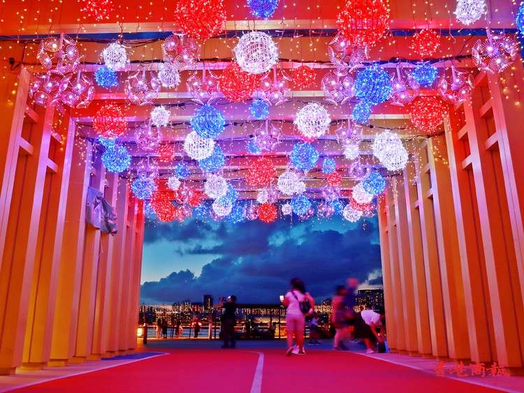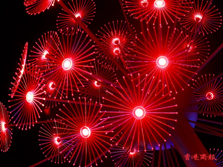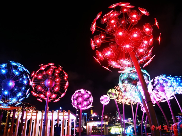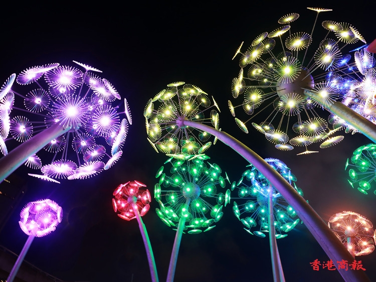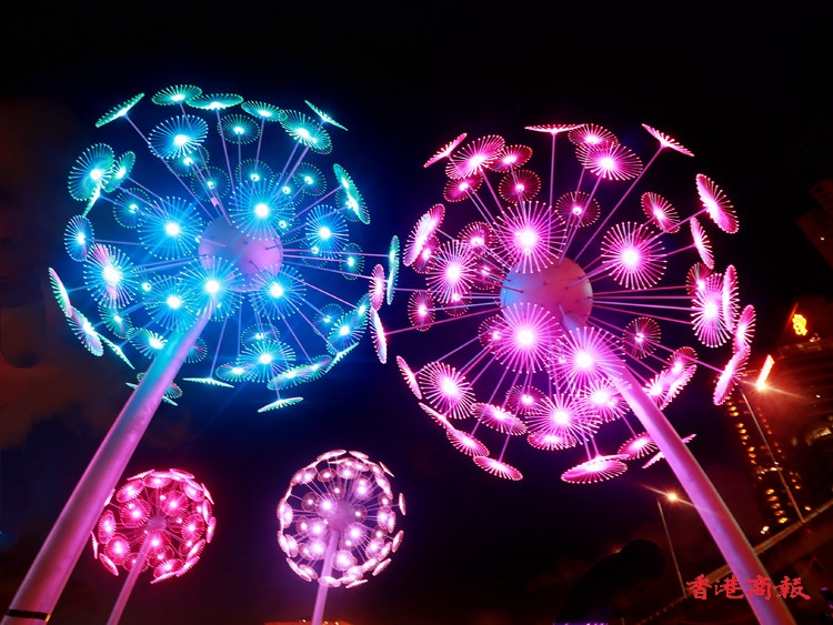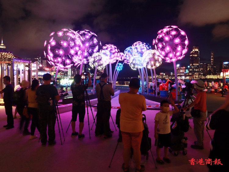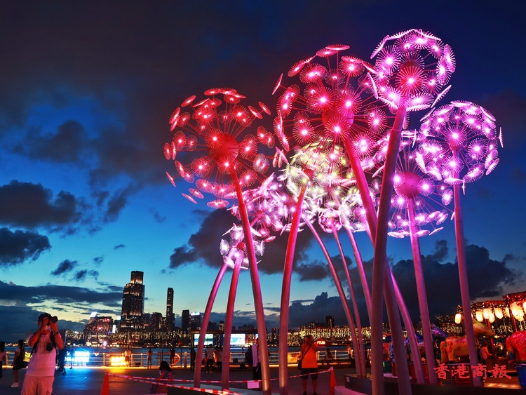 其中炮台山的東岸公園以「夏日納涼煙花」為主題,在公園內擺放了一組題為「花火」的藝術裝置,日間造型是蒲公英,每當夜幕低垂,即幻化成璀璨奪目的花火,美不勝收,加上公園周圍的燈光效果,絕對是不能錯過的打卡點。(記者 馮瀚文攝)
