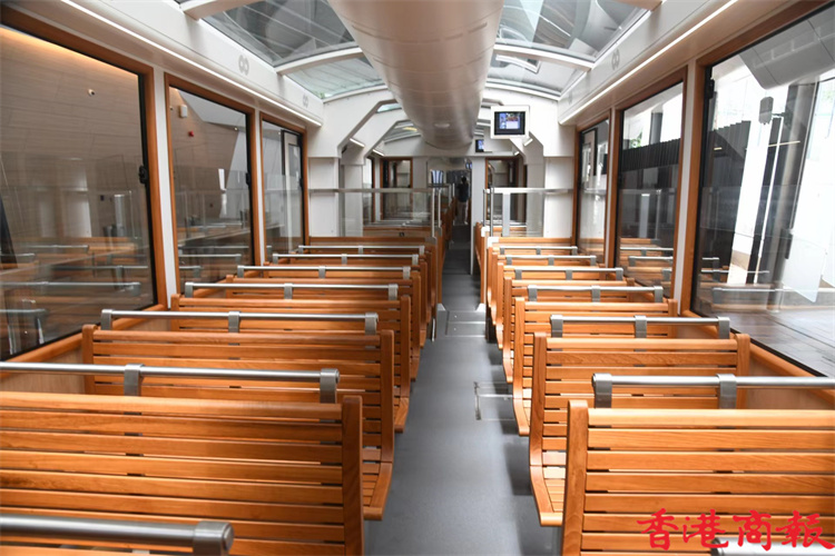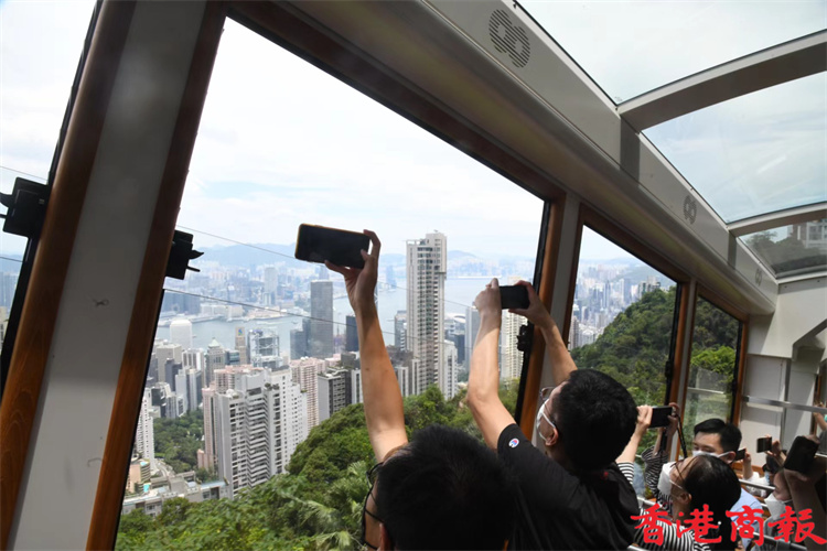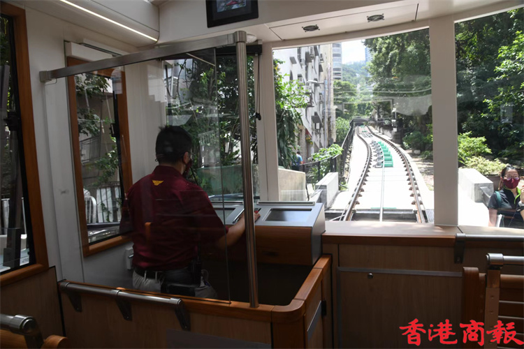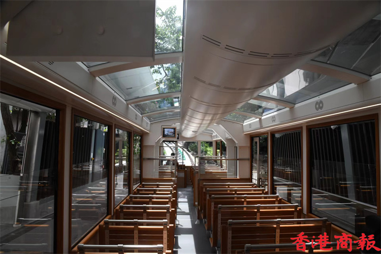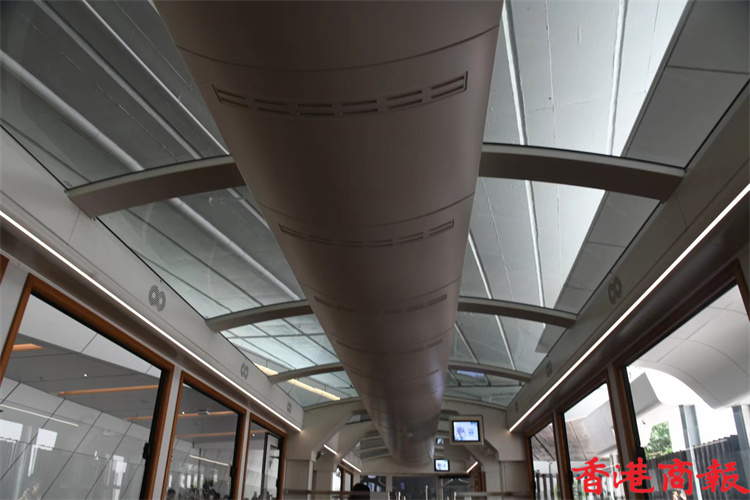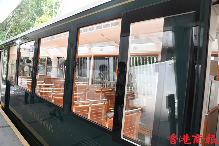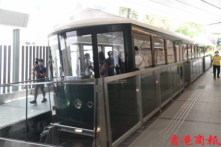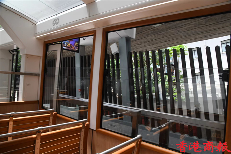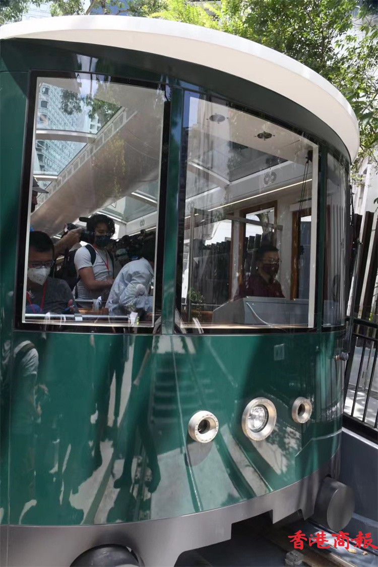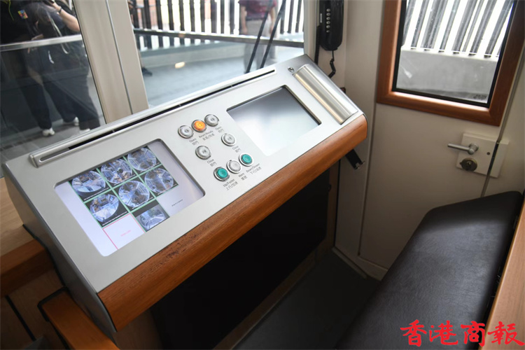 第六代山頂纜車設計結合了經典與現代的美學,設有寬闊的車門和全景玻璃窗,香港景色一覽無遺。纜車採用無梯級設計,方便殘疾人士出入。升級工程將候車時間縮短超過七成,同時全面翻新山頂總站;中環總站擴建後,室內候車站可容納多達1300人。另外增設了五大體驗區域,包括逾10米高的雕塑作品《無限之眼》、第一代山頂纜車複製品、沉浸式展示幕牆,讓市民可以盡情拍照打卡。(攝影部蔡啟文攝)