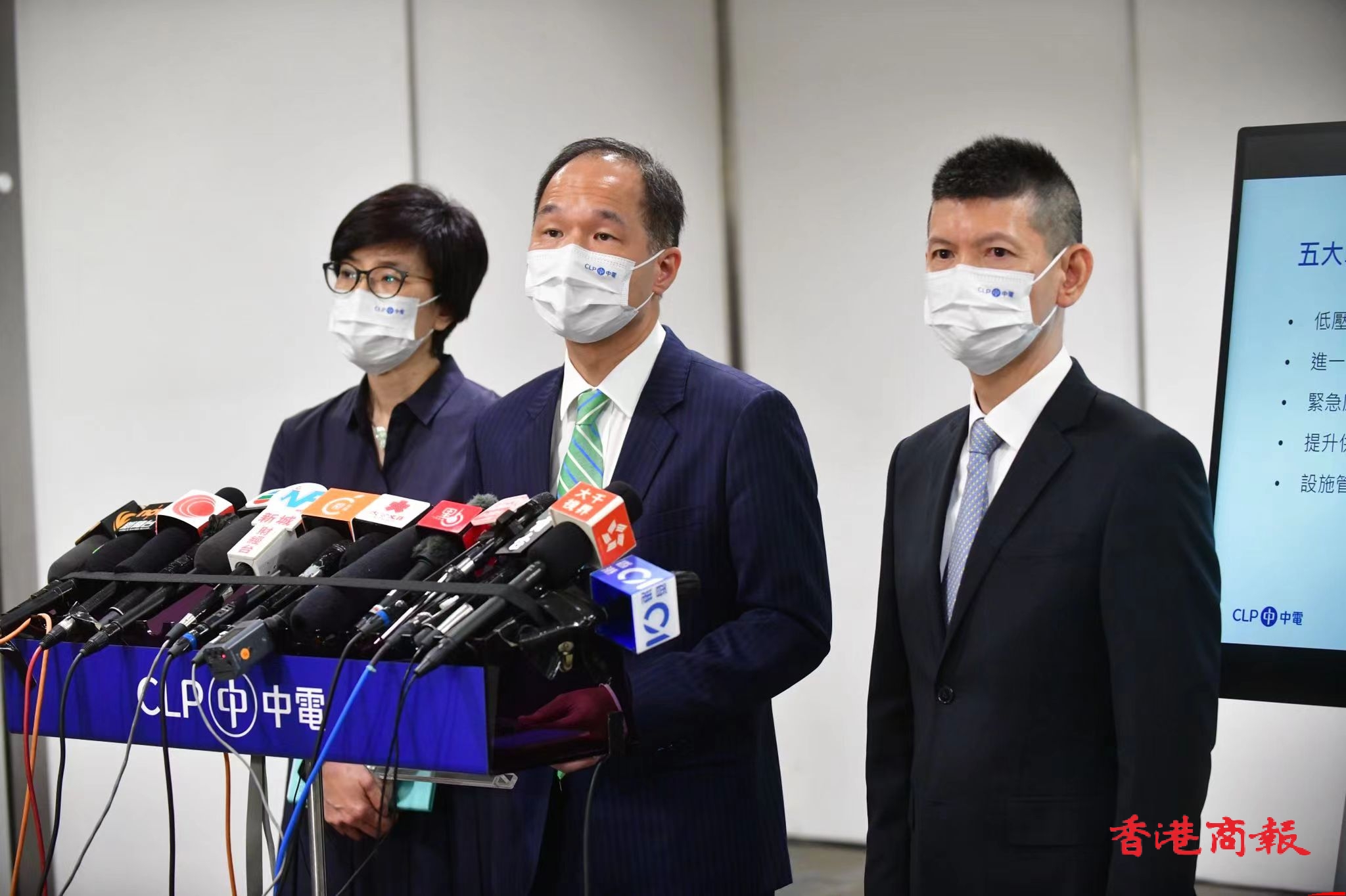 中華電力公布元朗電纜橋起火事故調查報告。左起:中華電力企業發展總裁莊偉茵、中華電力總裁蔣東強、中華電力輸電及供電業務部高級總監張寶中。記者 崔俊良攝