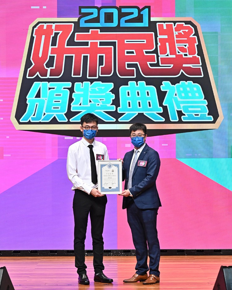 圖為撲滅罪行委員會委員顏汶羽(右)頒發「好市民獎」予得奬市民朱宥蔚。