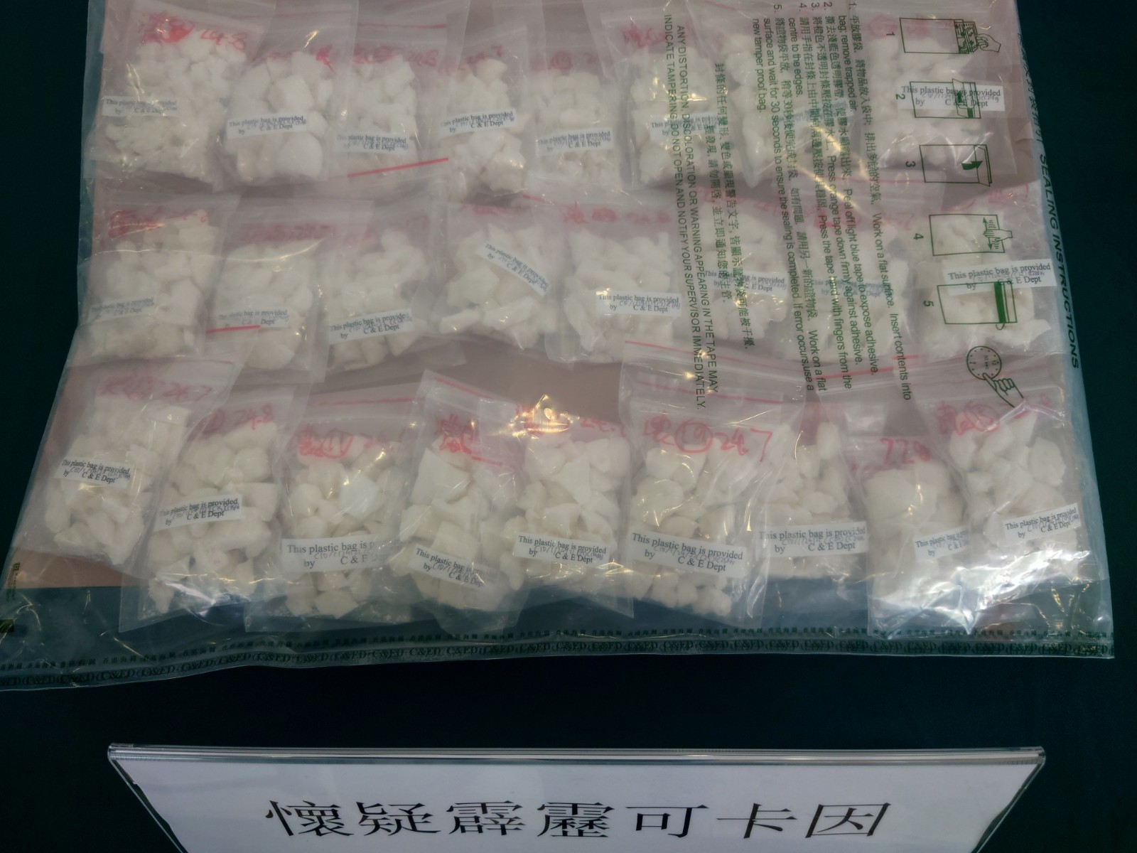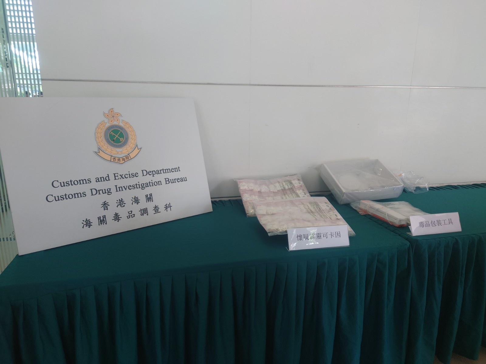 海關毒品調查科目品調查第三組調查主任方子洋今日(2日)表示,昨午在將軍澳區展開反毒品行動,關員掩至唐賢街一個私人屋苑,在其中一幢大廈對開截停一名目標男子。他當時持有一個紙袋,內裡有兩包共重1.1公斤的霹靂可卡因,相信疑犯當時準備帶貨給拆家,馬上將他拘捕。其後將疑犯押返該幢大廈一個住宅單位,在內裡搜出一批毒品包裝工具。