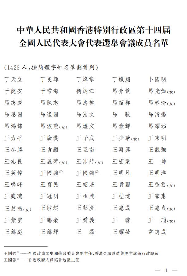 中華人民共和國香港特別行政區第十四屆全國人民代表大會代表選舉會議成員名單