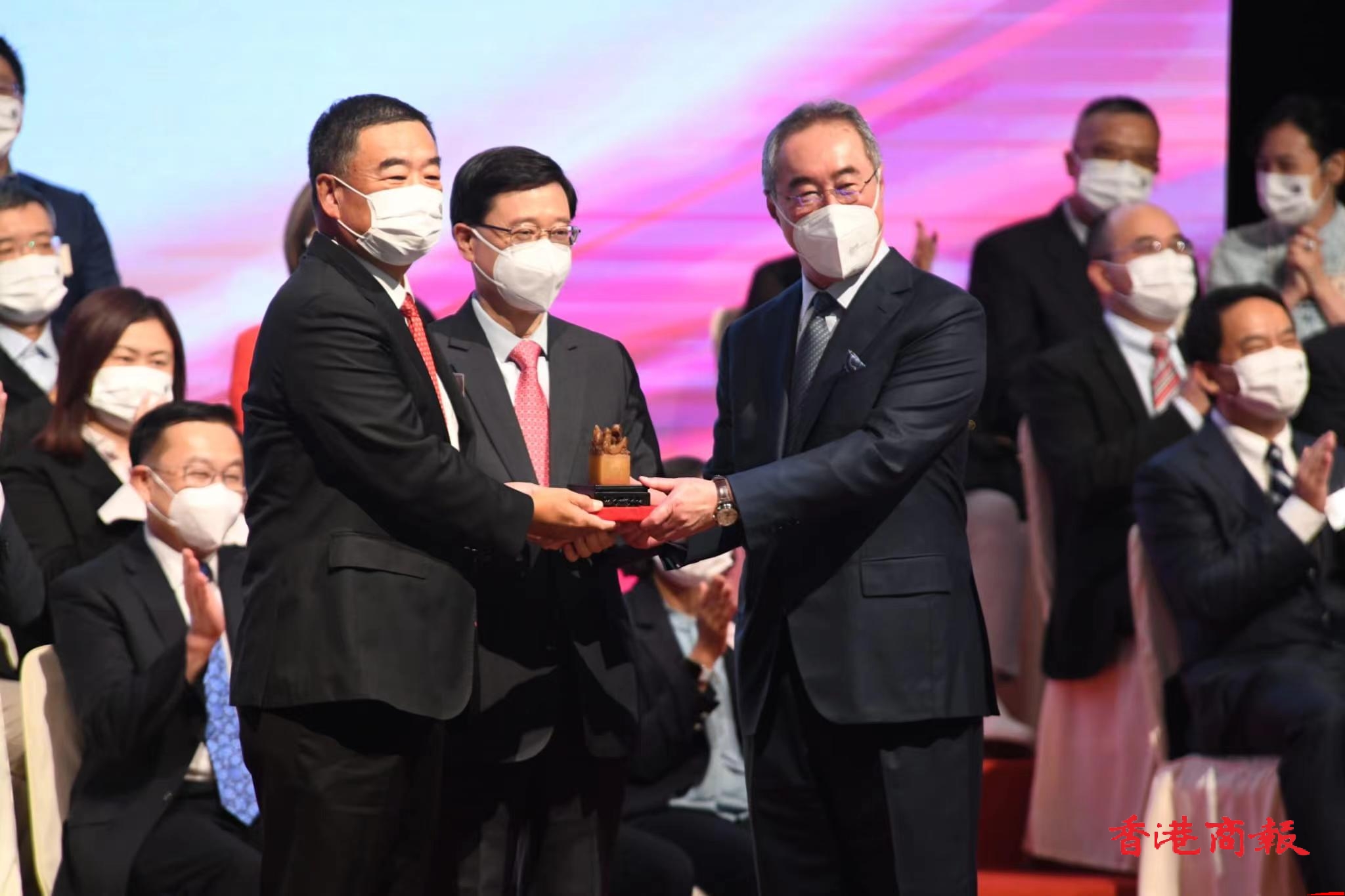在行政長官李家超(中)的見證下,香港江蘇社團總會創會會長唐英年(右)把會印交給了新任會長姚茂龍(左)。蔡啟文攝