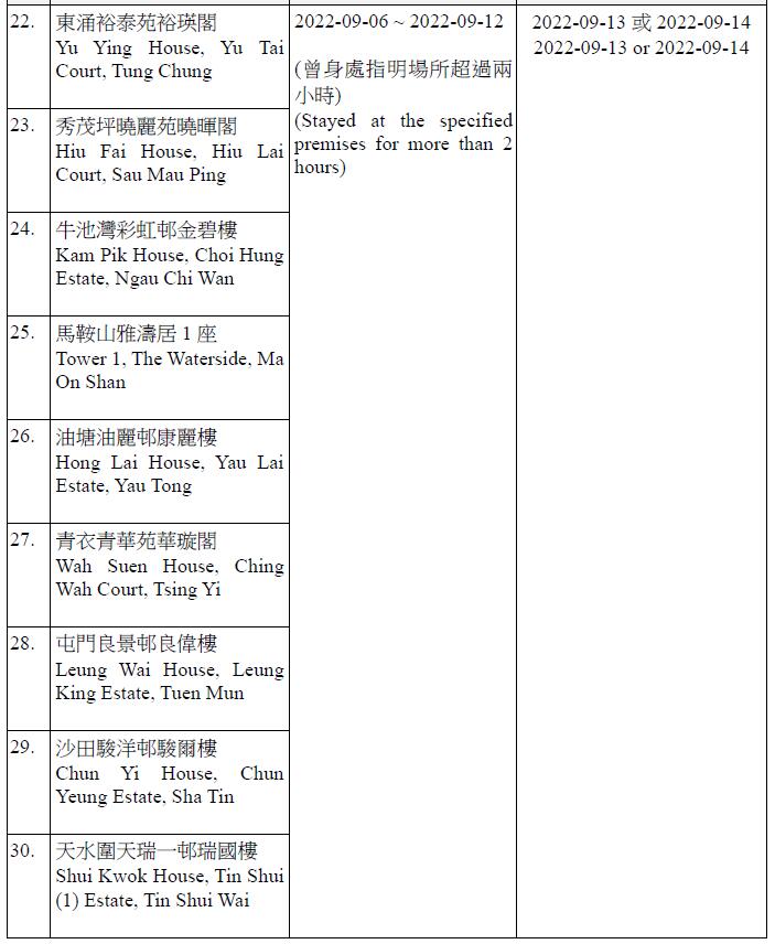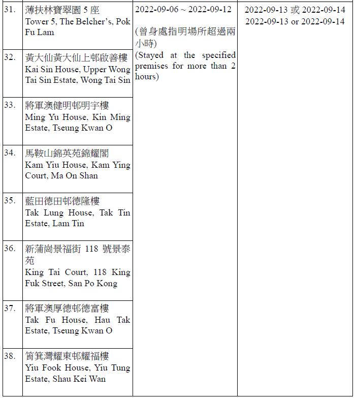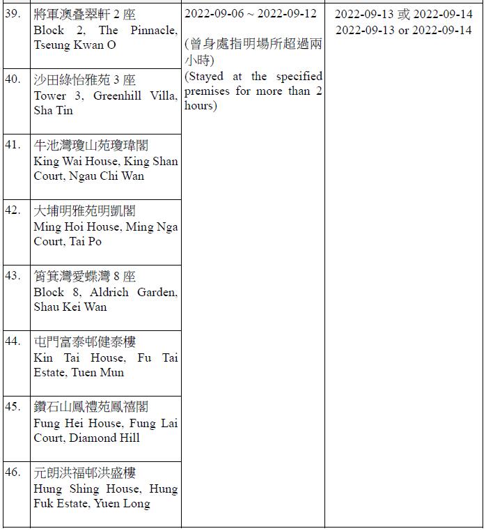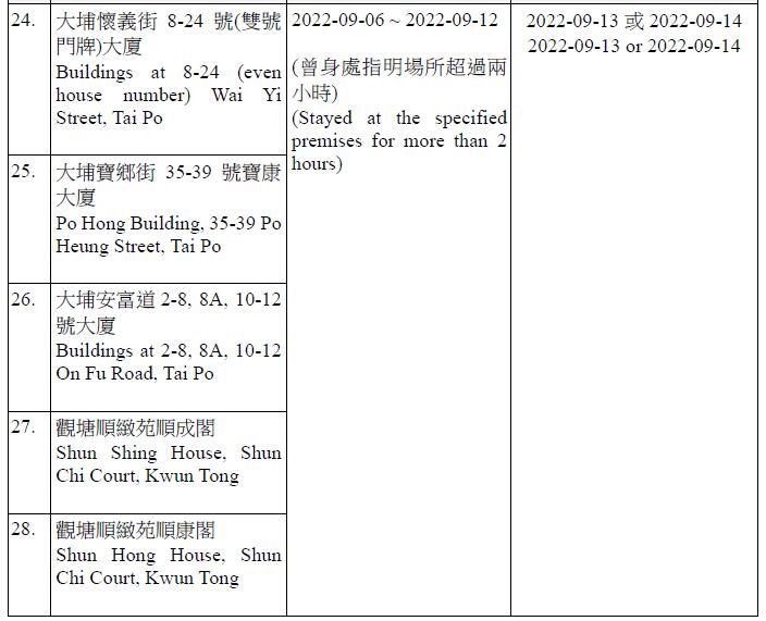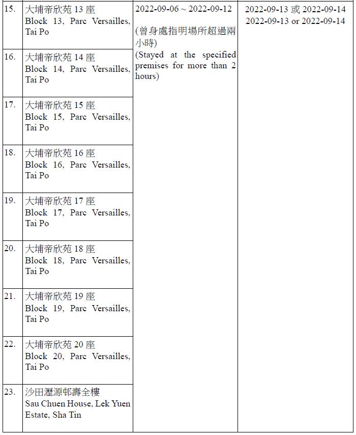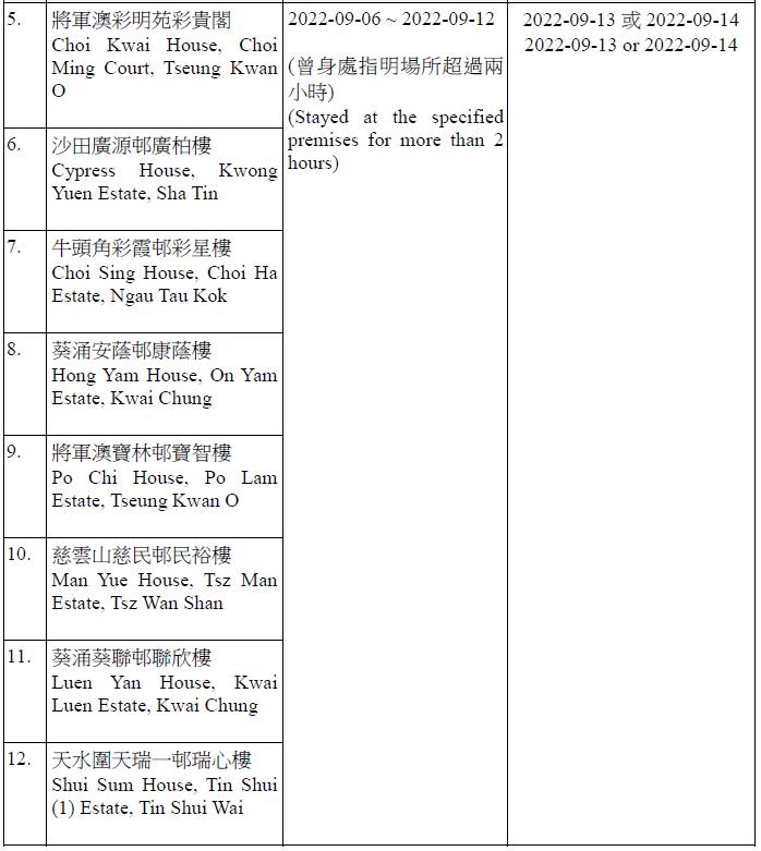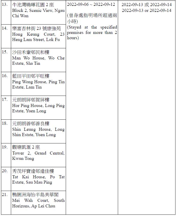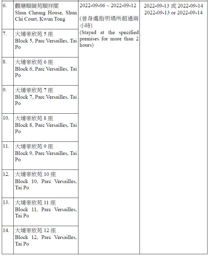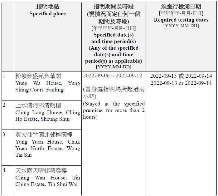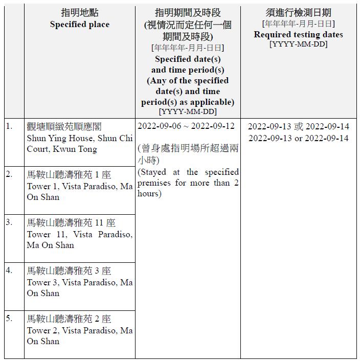 因應多宗陽性檢測個案,及採集到檢測呈陽性的污水樣本,港府今晚(12日)就強制檢測公告刊憲,要求於指定期間曾身處74個指明地方的人士,須在9月13日或9月14日接受核酸檢測,包括粉嶺雍盛苑雍華閣、上水清河邨清朗樓、黃大仙竹園北邨榕園樓、天水圍天晴邨晴雲樓、將軍澳彩明苑彩貴閣、沙田廣源邨廣柏樓、牛頭角彩霞邨彩星樓、葵涌安蔭邨康蔭樓、將軍澳寶林邨寶智樓、慈雲山慈民邨民裕樓等大廈。