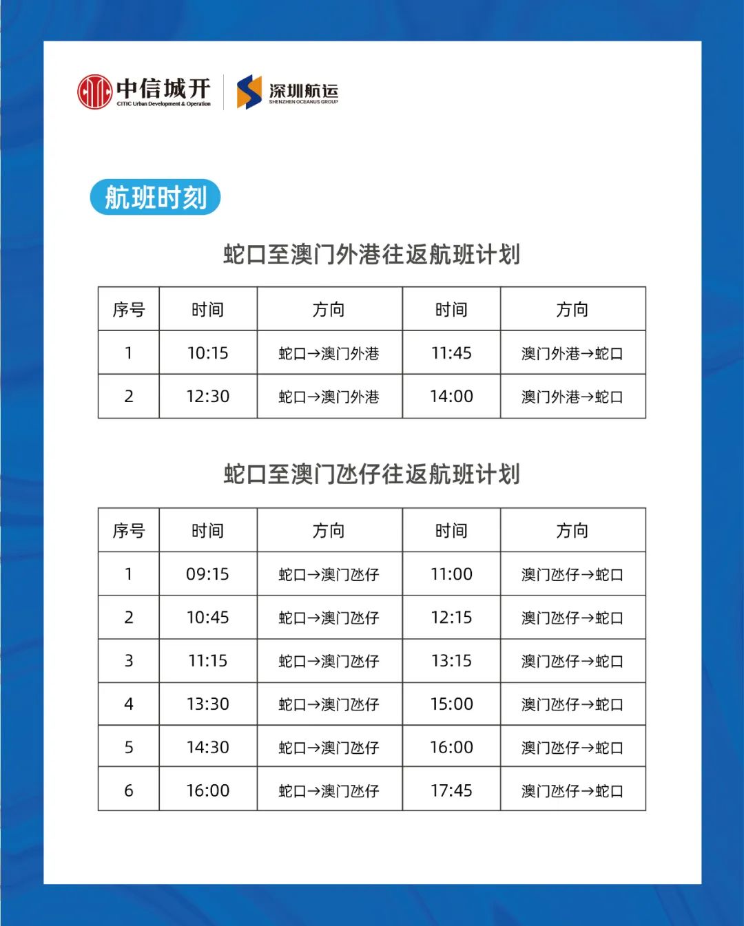 根據疫情防控最新要求,為有序恢復並促進粵澳兩地人員往來,自9月14日起,深圳航運集團將恢復深圳蛇口至澳門(外港、氹仔)往返航線的航班運營。