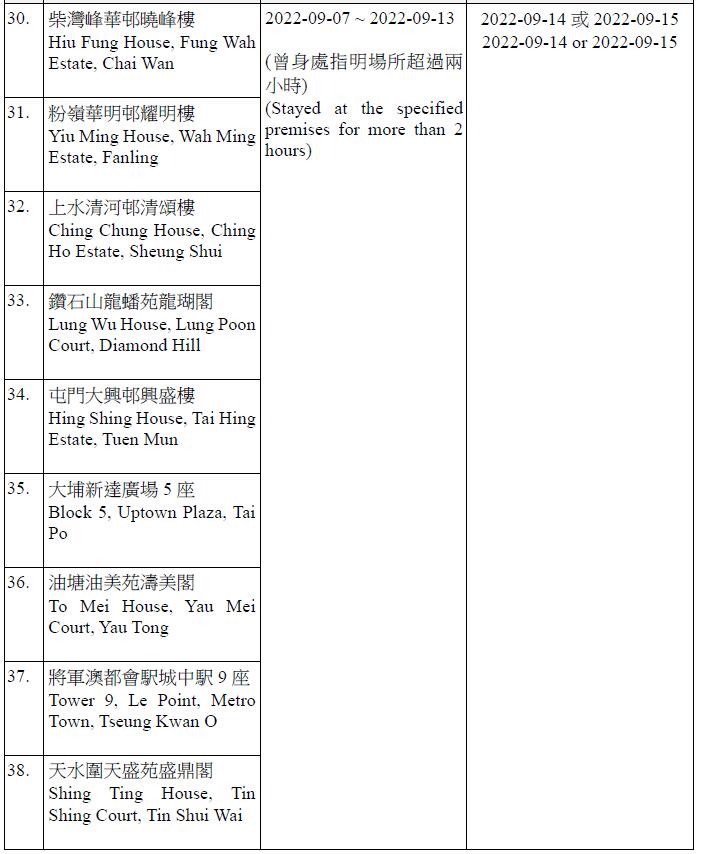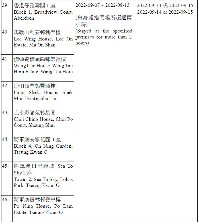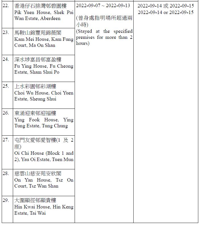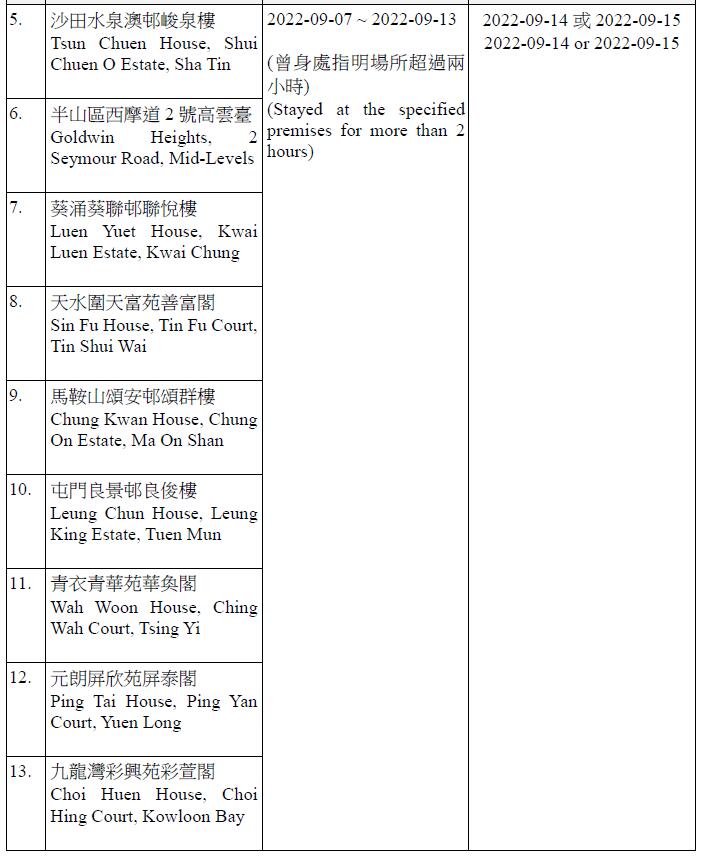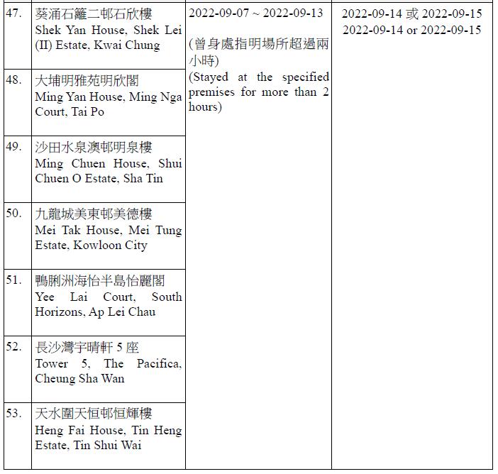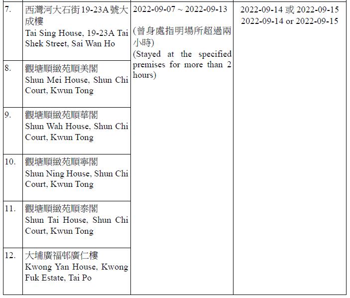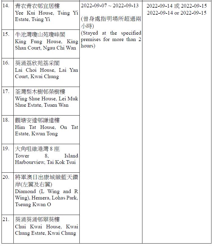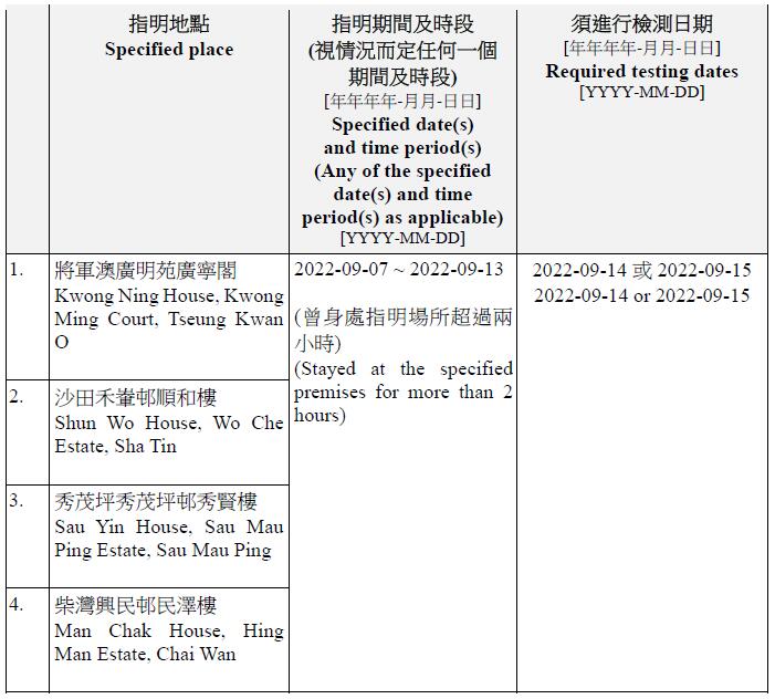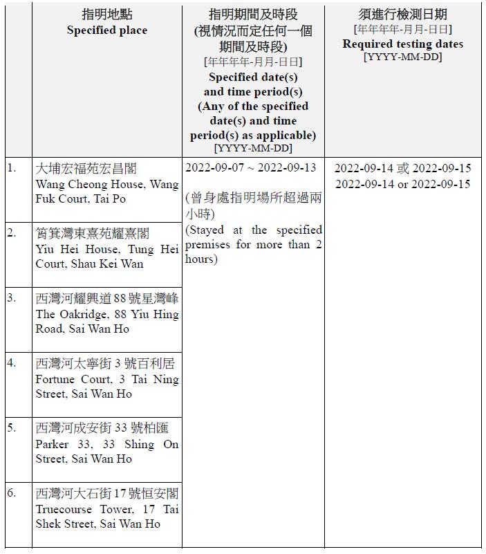 因應多宗陽性檢測個案,及採集到檢測呈陽性的污水樣本,港府今晚(13日)就強制檢測公告刊憲,要求於指定期間曾身處65個指明地方的人士,須在9月14日或9月15日接受核酸檢測,包括將軍澳廣明苑廣寧閣、沙田禾輋邨順和樓、秀茂坪秀茂坪邨秀賢樓、柴灣興民邨民澤樓、沙田水泉澳邨峻泉樓、半山區西摩道2號高雲台、葵涌葵聯邨聯悅樓、天水圍天富苑善富閣、馬鞍山頌安邨頌群樓、屯門良景邨良俊樓等。
