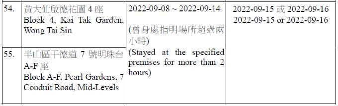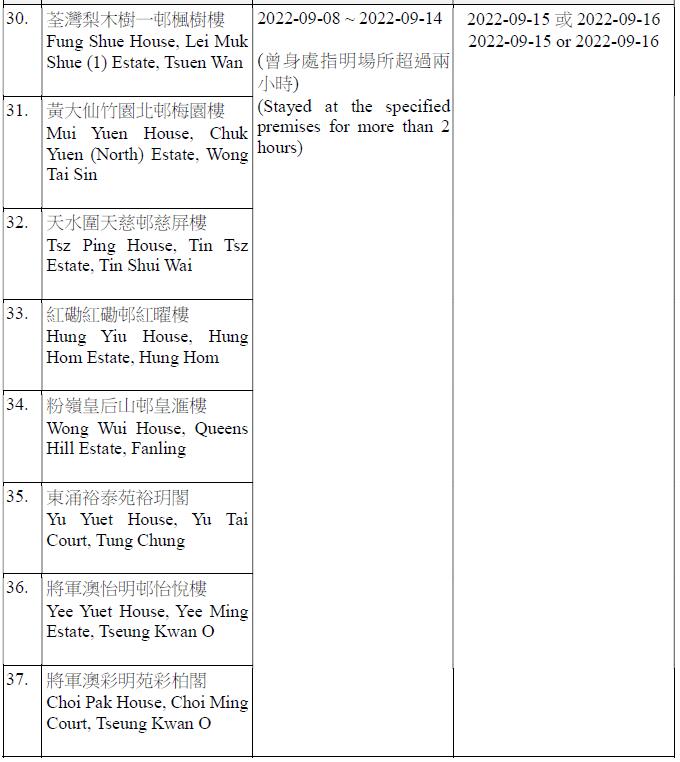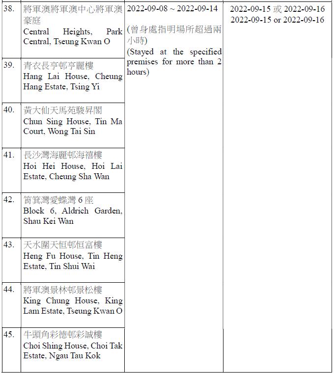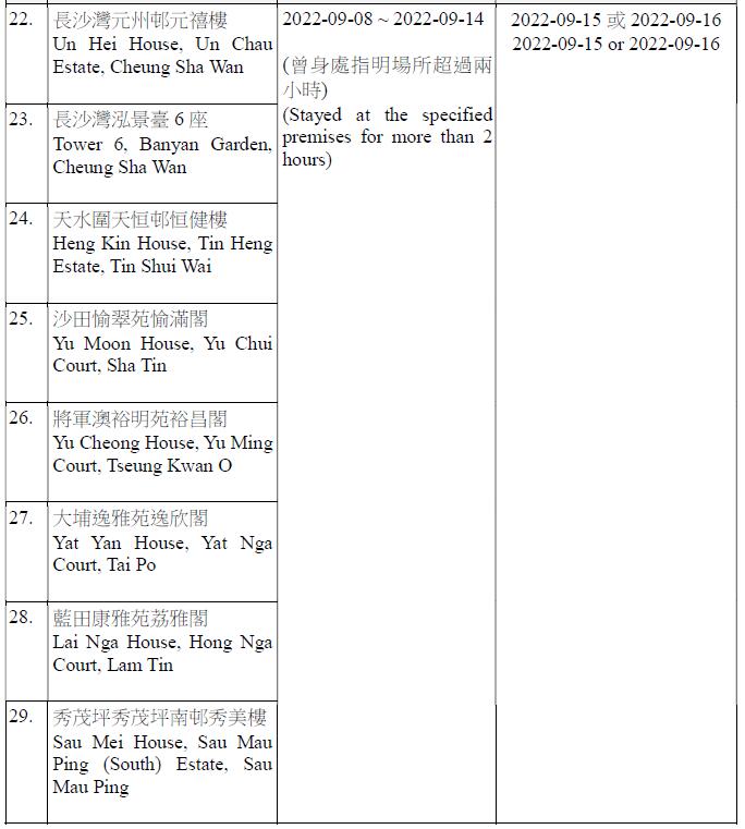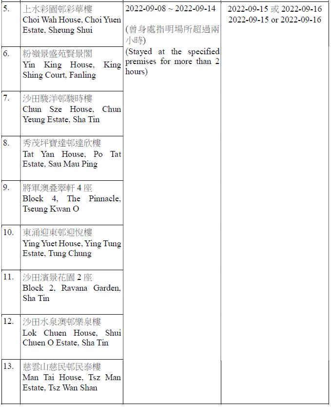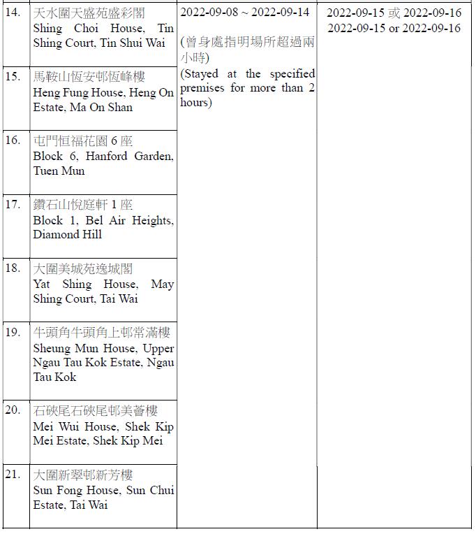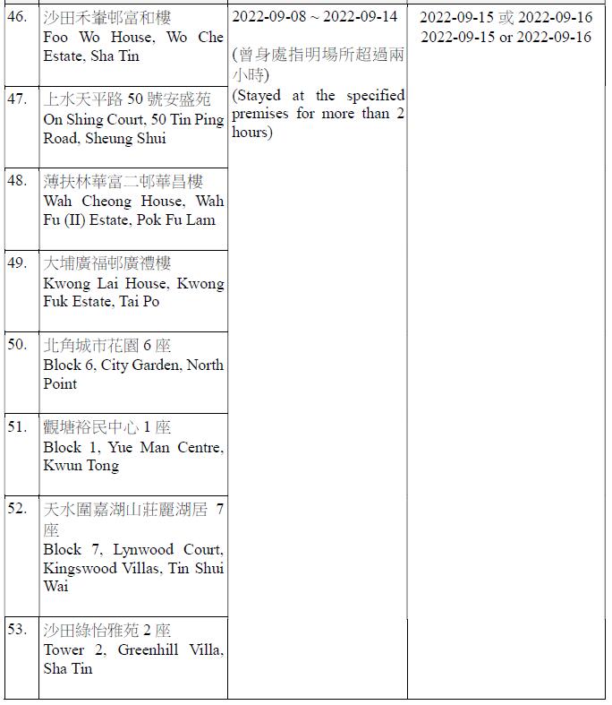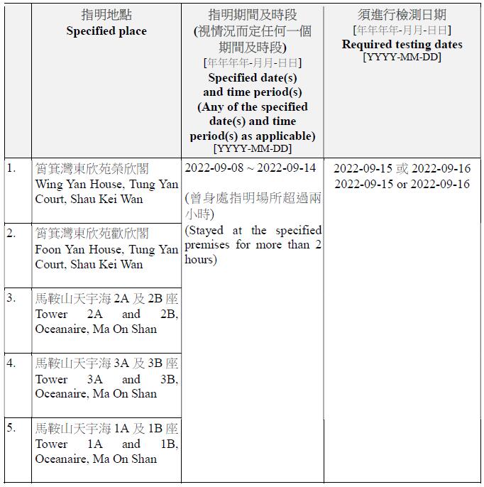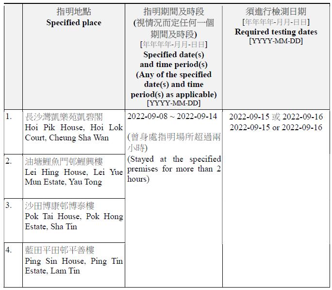因應多宗陽性檢測個案,及採集到檢測呈陽性的污水樣本,港府今晚(14日)就強制檢測公告刊憲,要求於指定期間曾身處60個指明地方的人士,須於9月15日或9月16日接受核酸檢測,包括長沙灣凱樂苑凱碧閣、油塘鯉魚門邨鯉興樓、沙田博康邨博泰樓、藍田平田邨平善樓、上水彩園邨彩華樓、粉嶺景盛苑賢景閣、沙田駿洋邨駿時樓、秀茂坪寶達邨達欣樓、將軍澳疊翠軒4座、東涌迎東邨迎悅樓等。