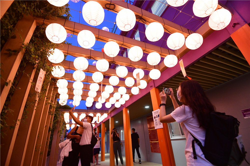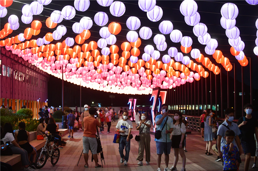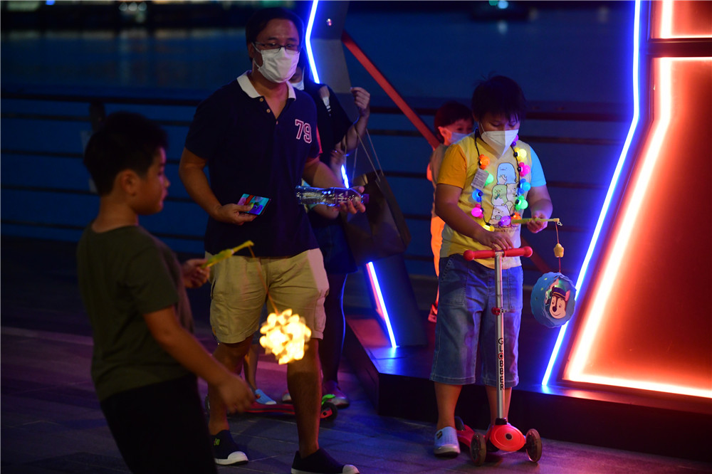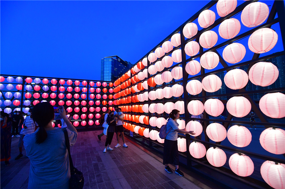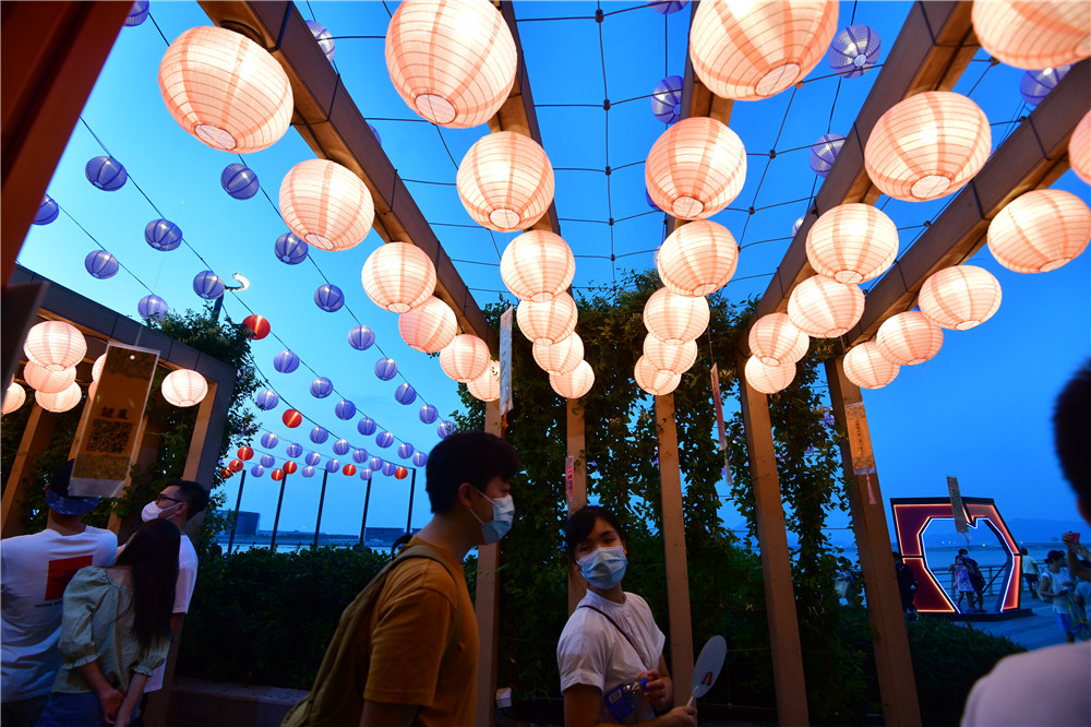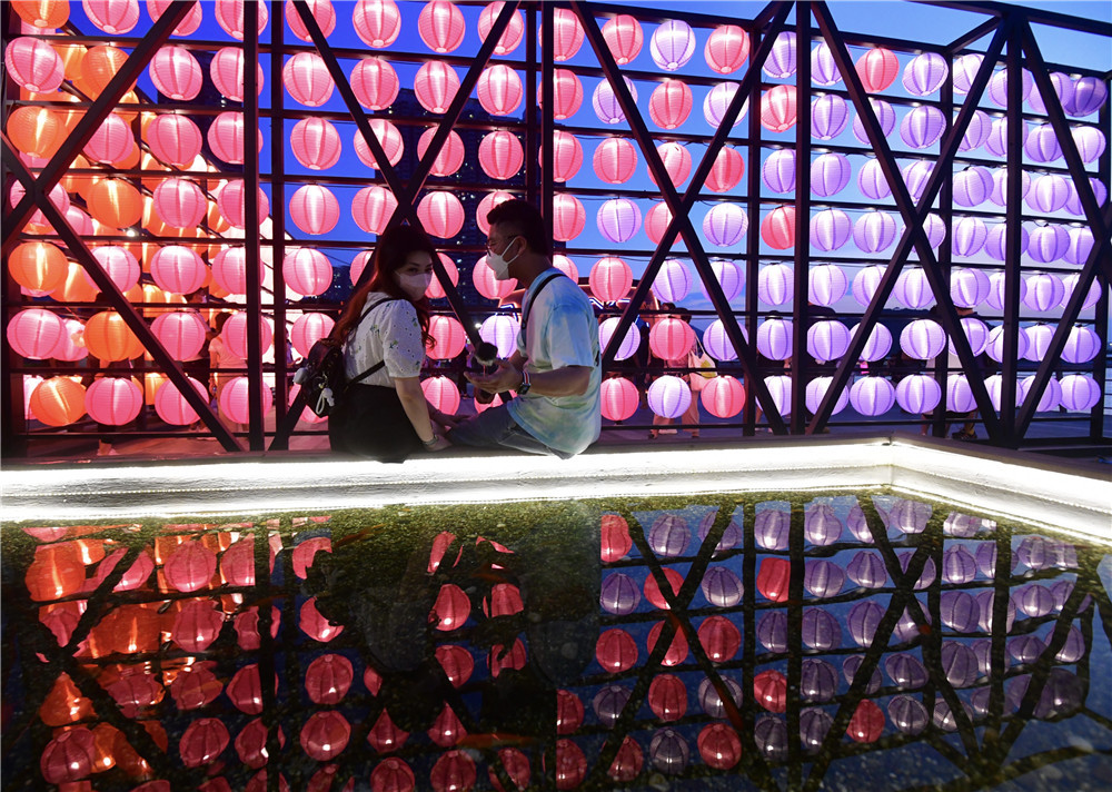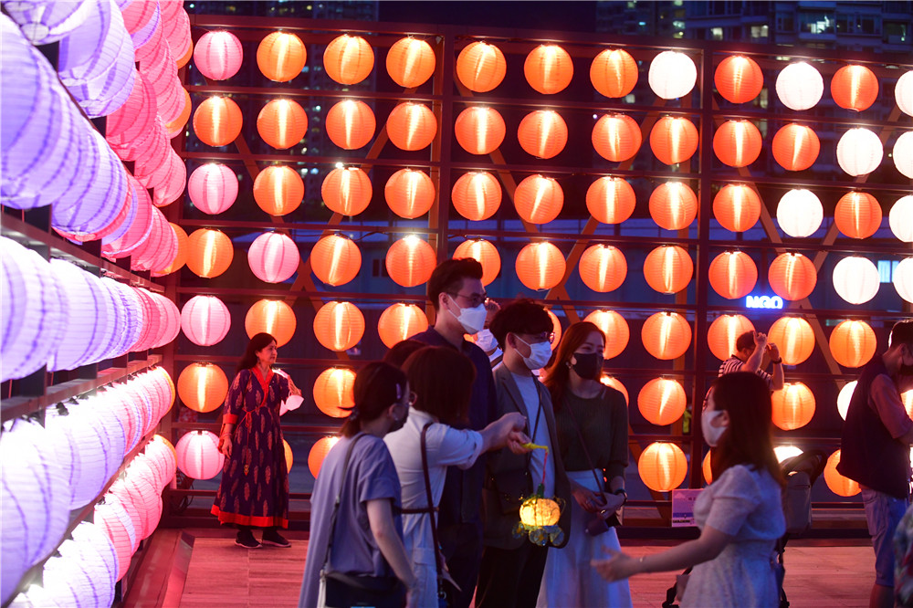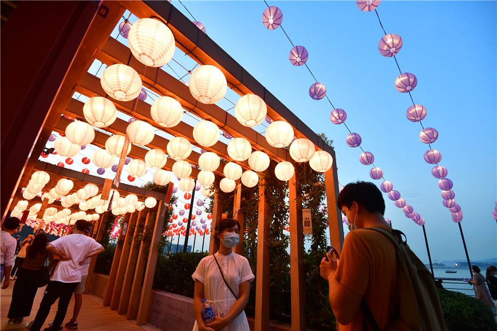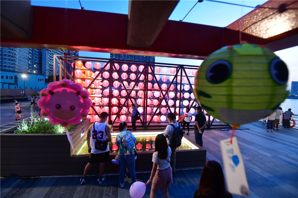 花燈節展出一系列中秋裝飾,包括巨型霓虹花燈,以及高達四米的花燈牆,將海濱打造成新式時尚的休閒地。海濱沿岸掛上逾千個燈籠,在花燈海襯托下,連同心型霓虹花燈,使東涌倍添潮流絢麗感,市民置身其中,充滿夢幻的感覺。(記者 崔俊良 攝)
