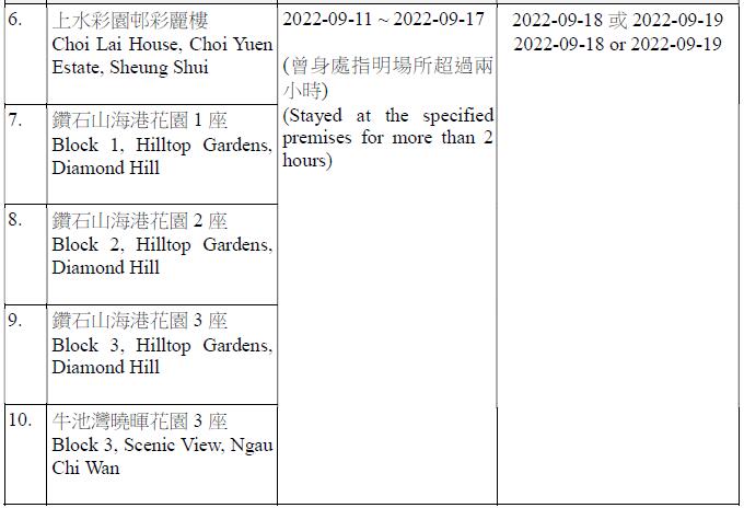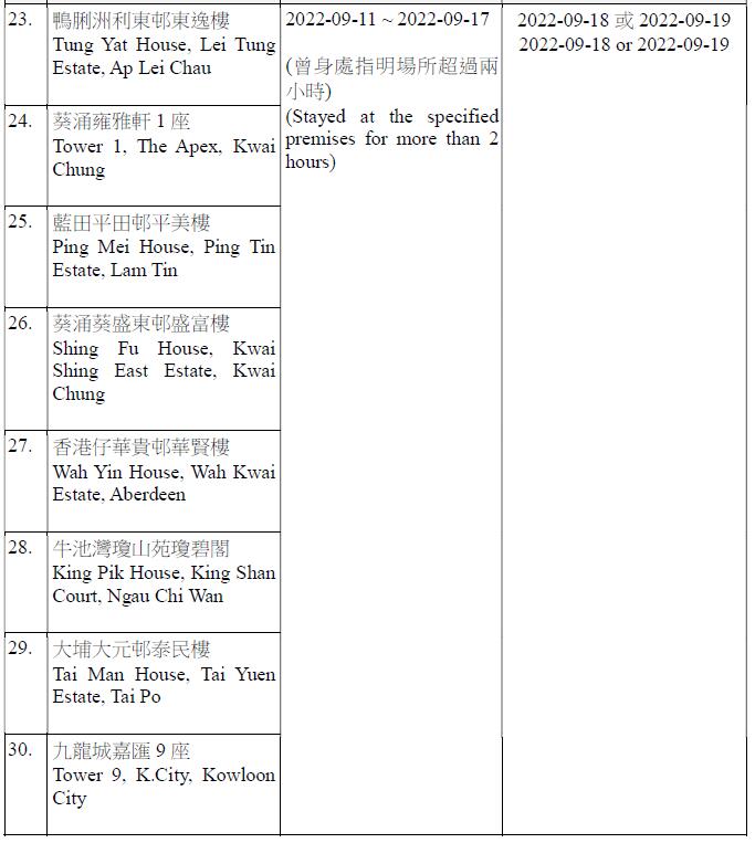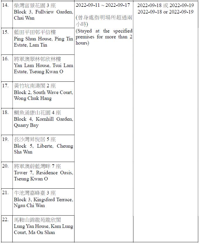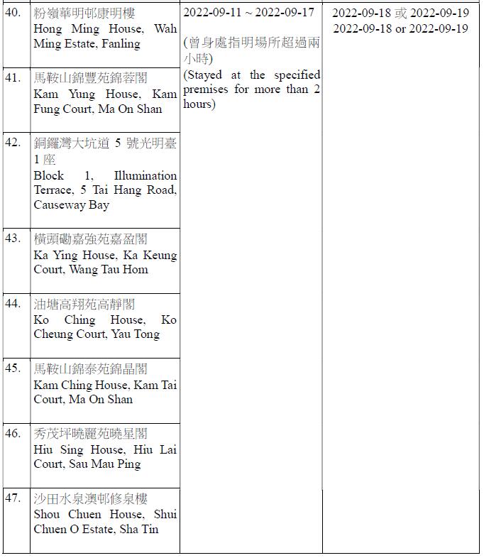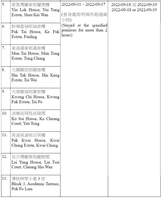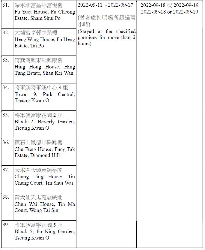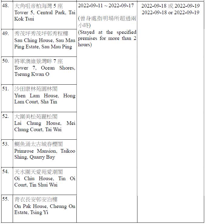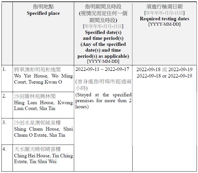 因應多宗陽性檢測個案,及採集到檢測呈陽性的污水樣本,港府今晚(17日)就《規例》下的強制檢測公告刊憲,要求於指定期間曾身處65個指明地方的人士,須在9月18日或9月19日接受核酸檢測,包括將軍澳和明苑和逸閣、沙田廣林苑興林閣、沙田水泉澳邨城泉樓、天水圍天晴邨晴喜樓、筲箕灣耀東邨耀樂樓、粉嶺嘉福邨福泰樓、東涌滿東邨滿泰樓、大圍顯徑邨顯德樓、大埔廣福邨廣智樓、油塘高翔苑高瑞閣等。