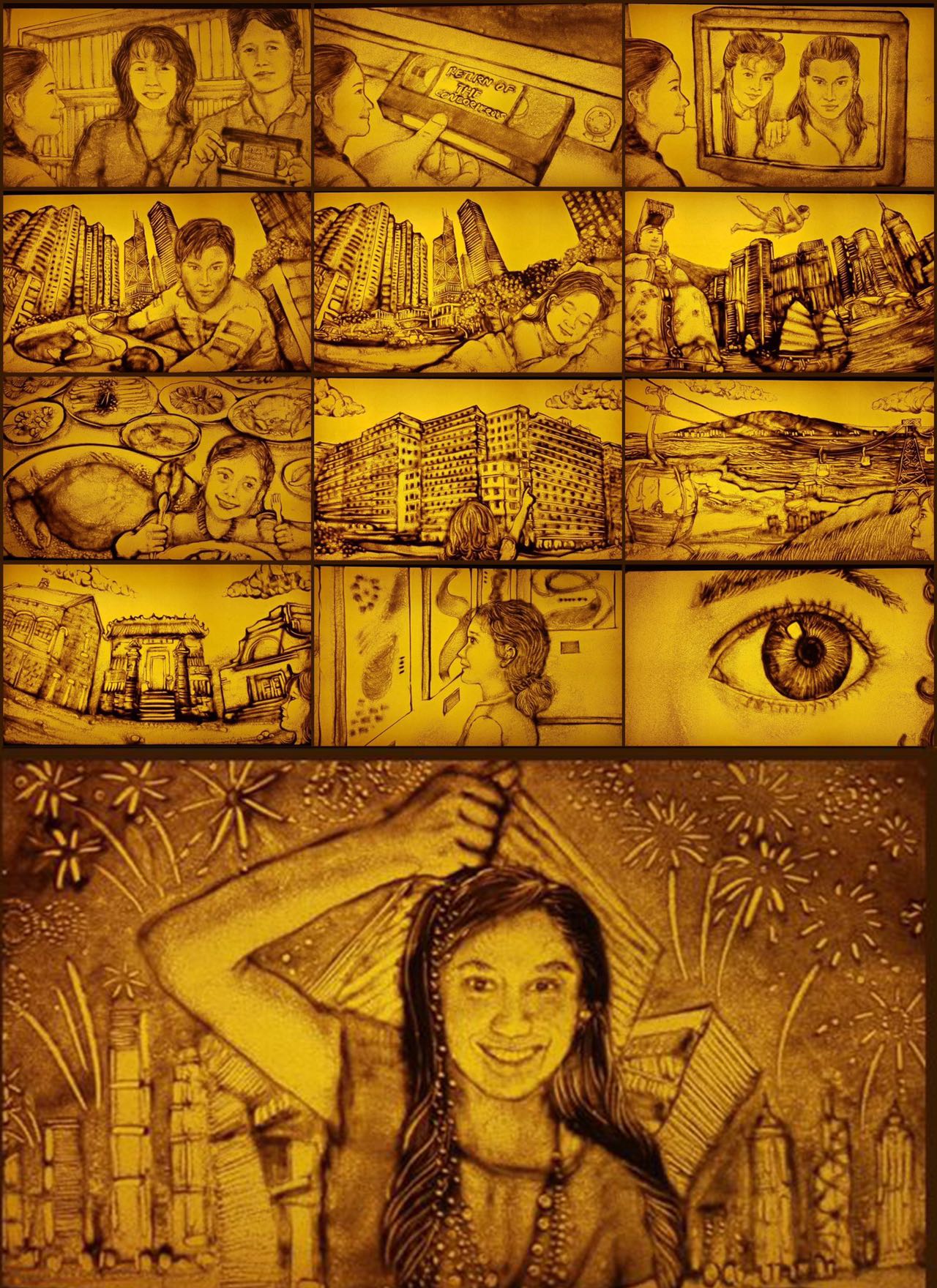 印尼沙畫藝術家Vina Candrawati,則選擇以小時候和家人到影視店租借港產片為主題,在作品中以沙畫重現劉德華《神鵰俠侶》及《烈火戰車》的經典造型,半分鐘內劉德華由楊過化身成賽車手。