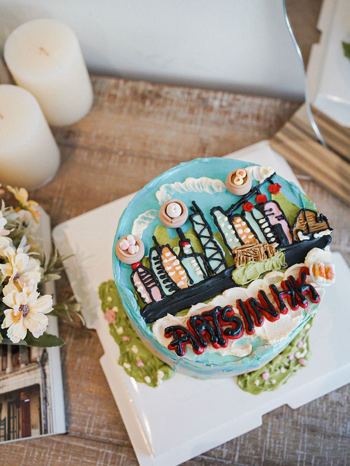 香港薈萃了中西飲食文化,地道港式飲茶深受旅客歡迎,新加坡蛋糕藝術家Noel Lin在蛋糕上畫上維港海岸線,再配以港式點心,構成色彩繽紛的特色蛋糕。