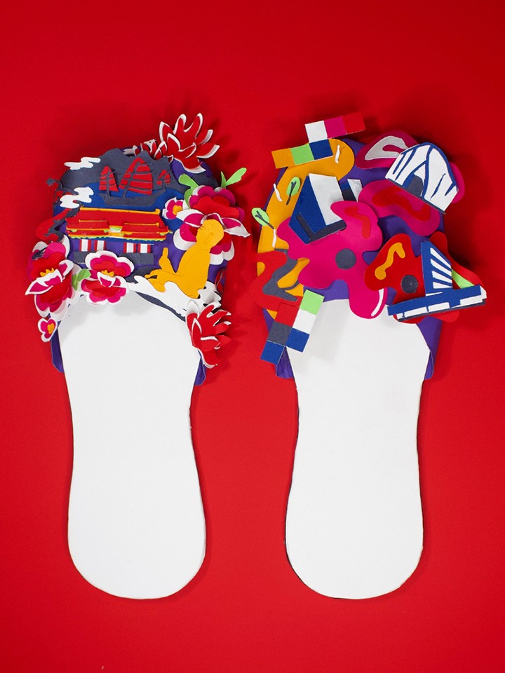 菲律賓紙藝藝術家Krissie Mateo以先達繡花鞋店的三代傳承故事為主題,以紙品繡花鞋作基礎,在鞋面以香港傳統特色及最新景點作裝飾。