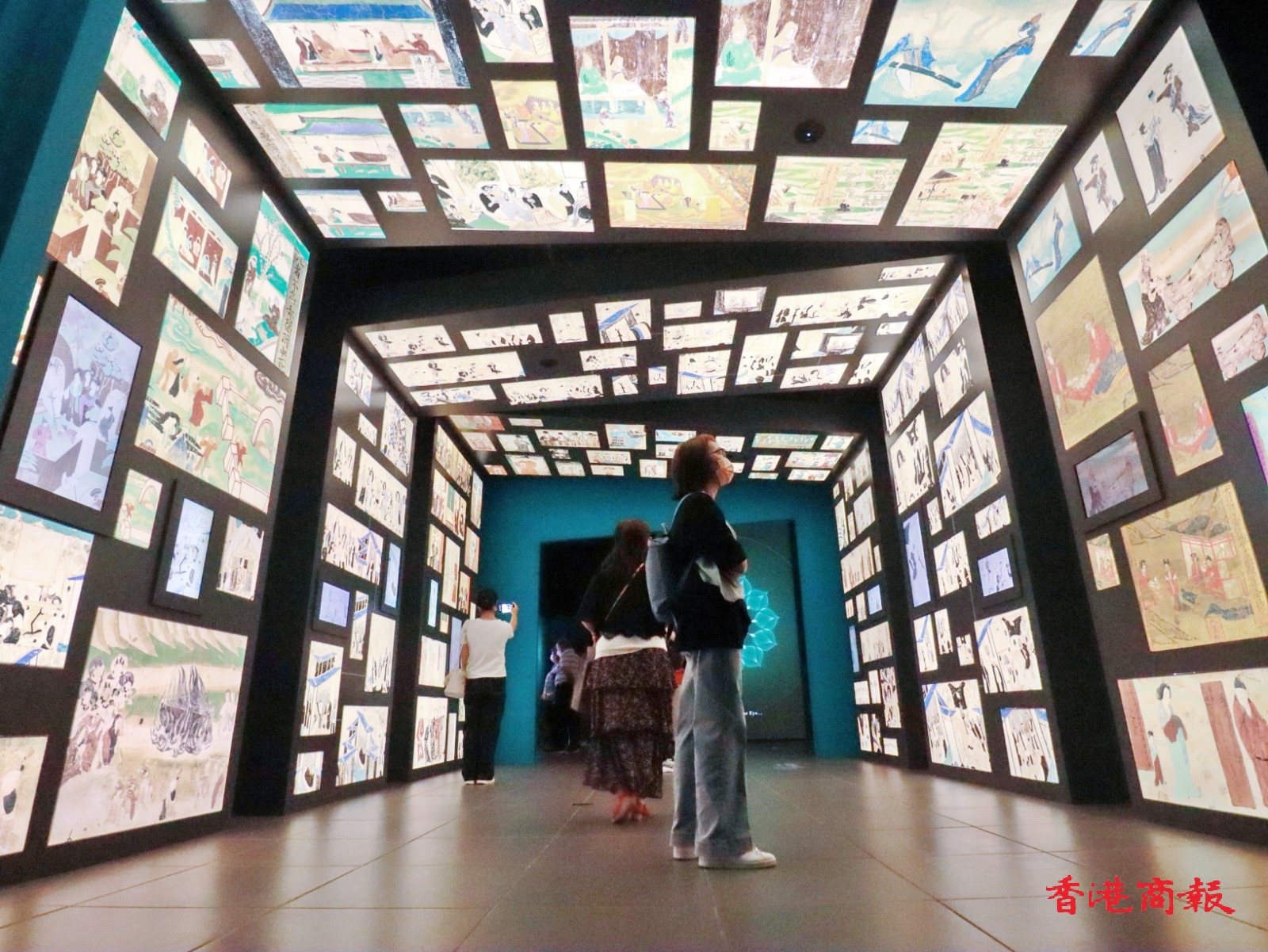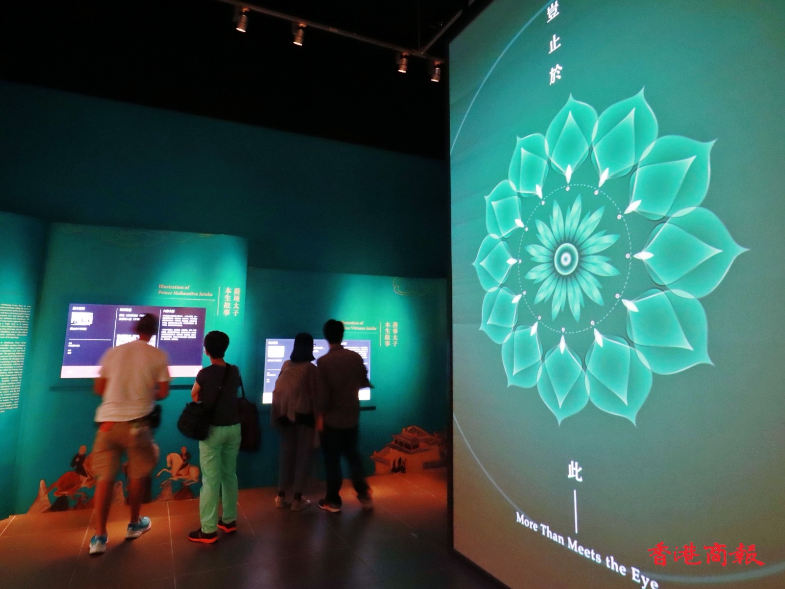 這次展覽加入了不少藝術科技元素,以沉浸式投影及數碼技術重新解讀出自莫高窟第17窟北宋的《報父母恩重經變》絹畫,娓娓道出父母養育子女的艱辛,並宣導子女謹守孝道。展覽中的另一沉浸式展示「山水之間」則以美學角度剖析敦煌壁畫中山水之美及探討人與自然之間的相依共存。(馮瀚文攝)