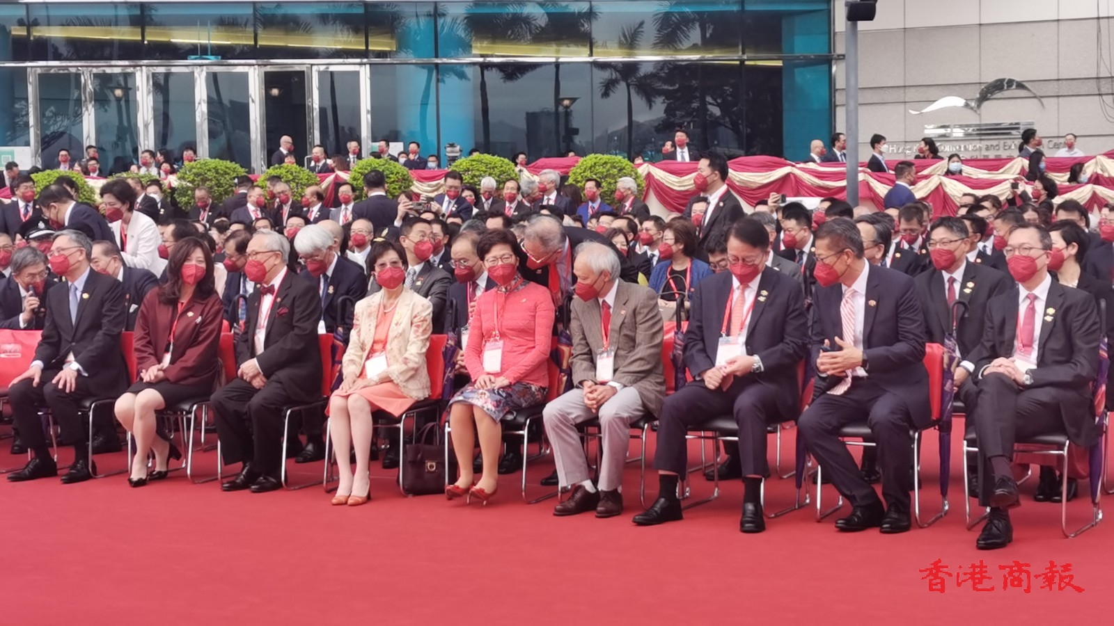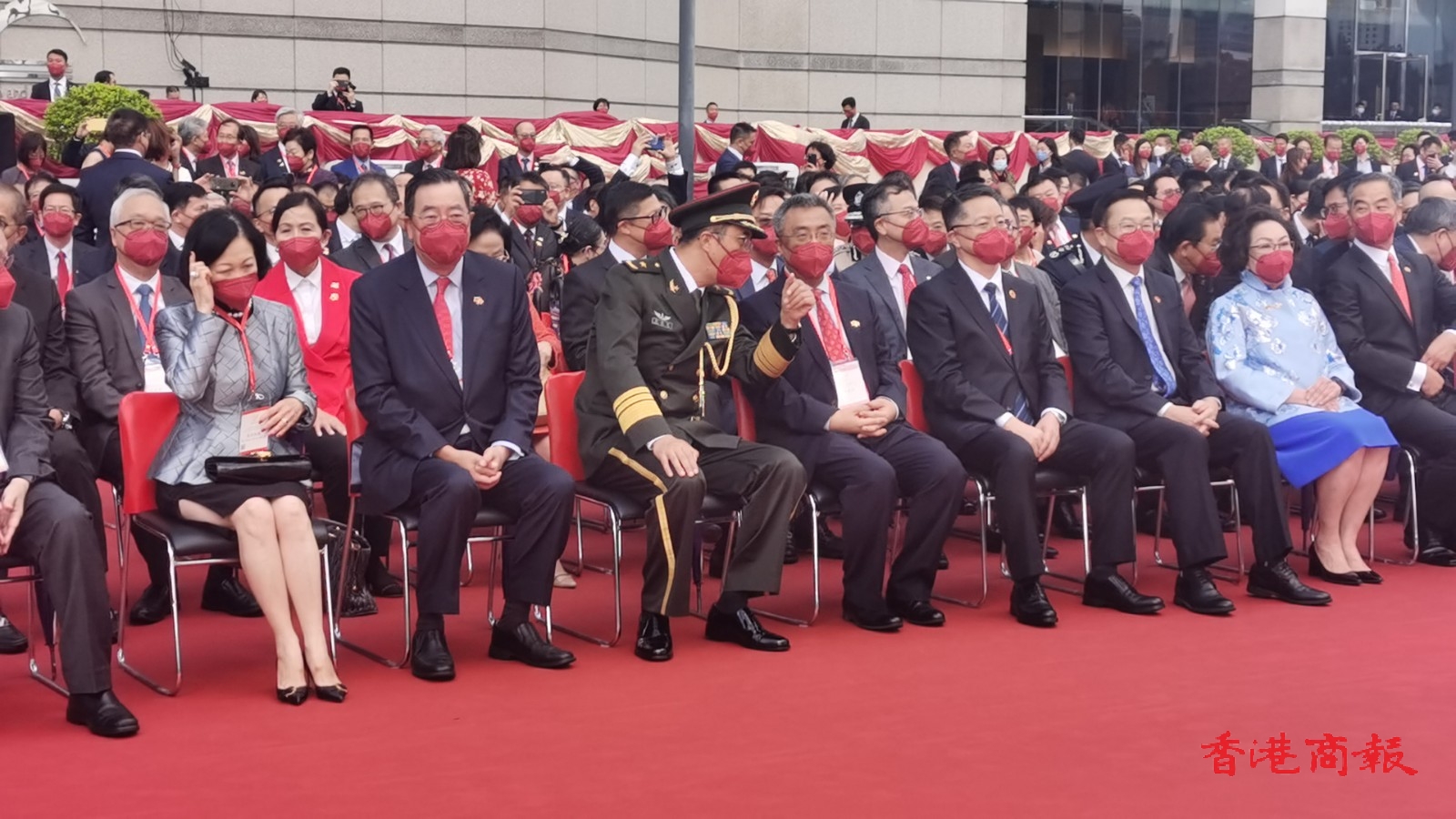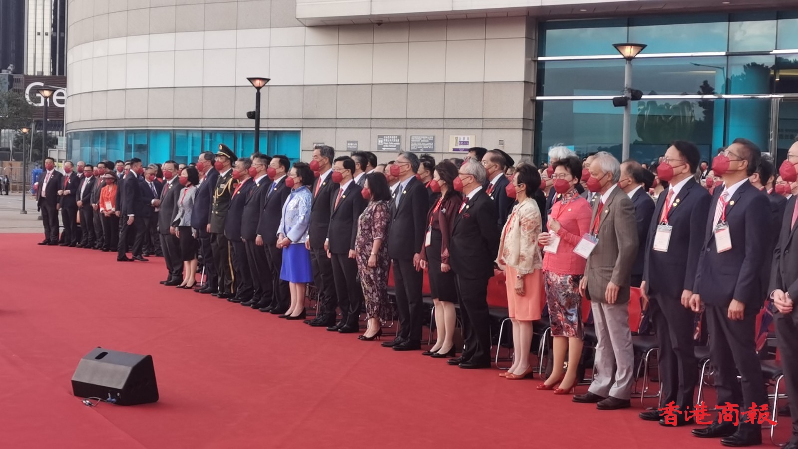 出席升旗儀式嘉賓均戴上紅色口罩,包括行政長官李家超、特區政府司局長官員、行政會議成員、全國政協副主席梁振英伉儷、前行政長官林鄭月娥及曾蔭權,和中央駐港機構代表等。