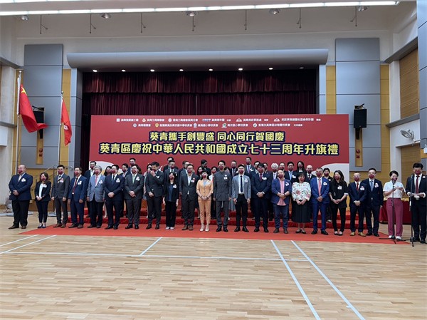 葵青各界人士於10月1日上午在石籬社區會堂共聚一堂,一同舉行升旗典禮儀式,慶祝中華人民共和國成立73周年。