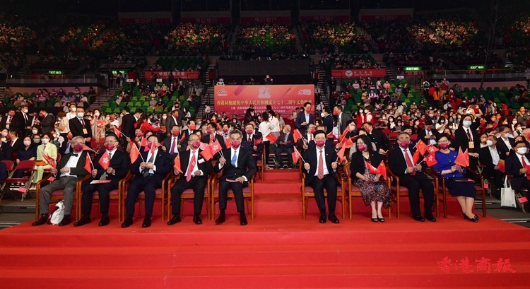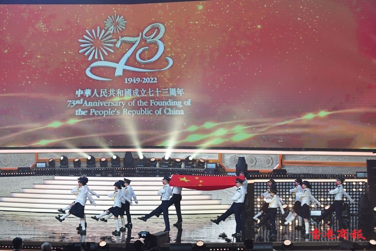 香港同胞慶祝中華人民共和國成立73周年籌備委員會今晚(10月1日)假香港體育館舉行「國慶文藝晚會」,今年主題為「盛世騰飛 璀璨未來」,透過一系列精彩及多元化的表演節目與市民歡賀國慶。籌委會主席團主席梁振英致詞時表示,過去一年,香港社會各界繼續積極主動融入國家發展大局,以香港之長,助力國家所需,粵港合作的三大平台布局更加成熟,香港居民在大灣區有了更廣闊的學業、事業和創業空間。