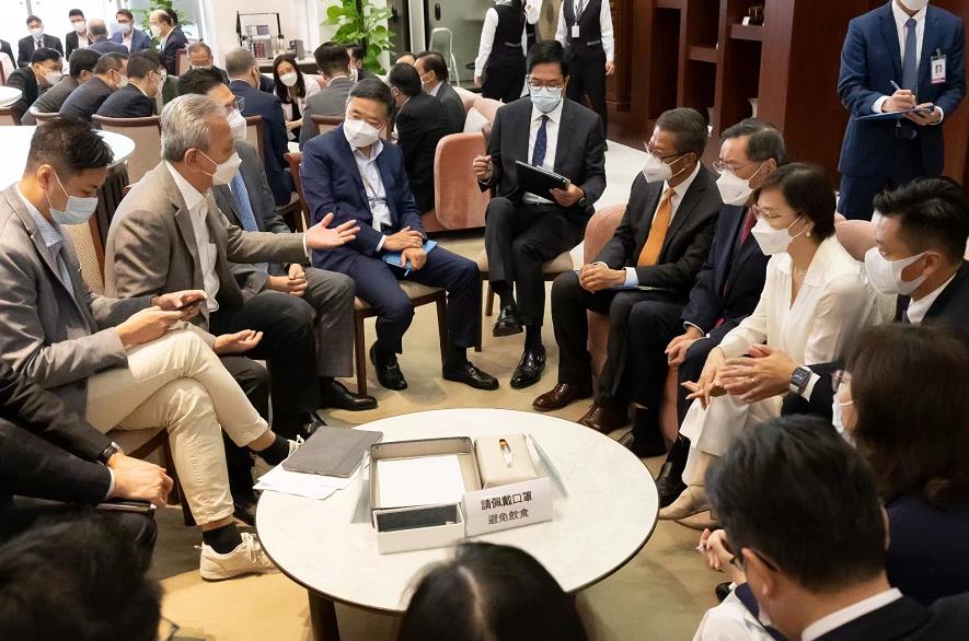 梁君彥則說,今日的交流會主要討論重點為經濟動力、吸引人才、房屋基建等。他稱議員在會上提出很多意見,期望政府可積極考慮議員的意見,納入新一屆政府首份施政報告中。他又稱期待議員復會後在立法會的參與。