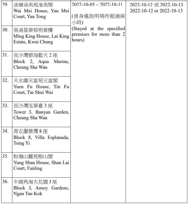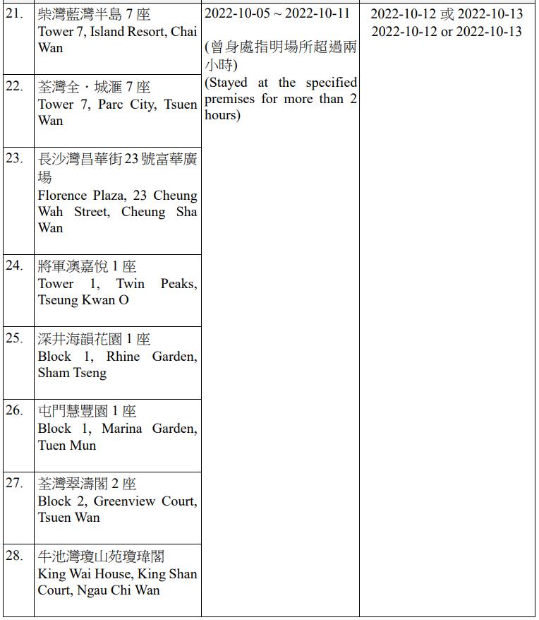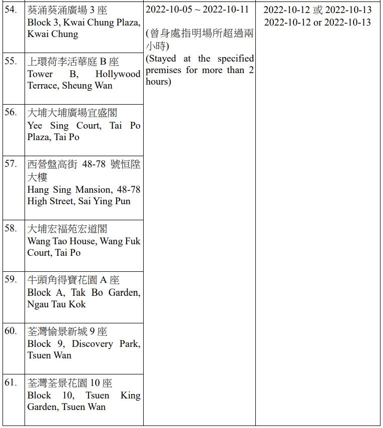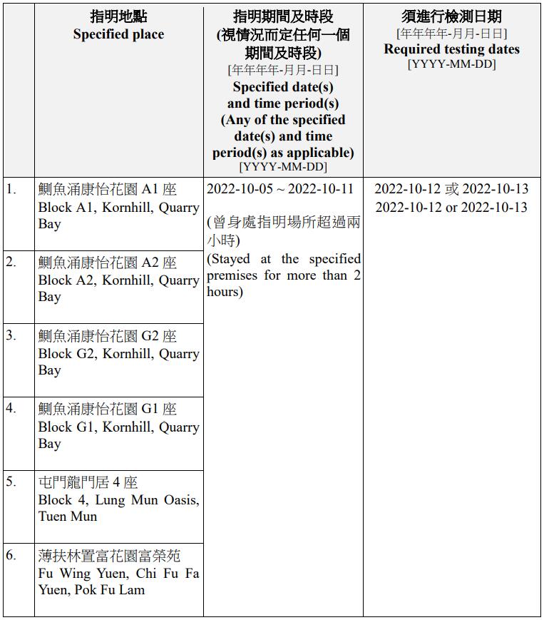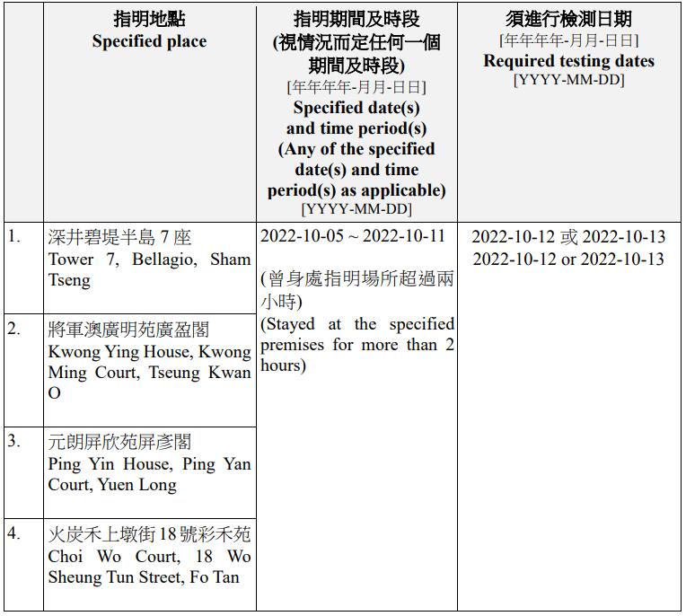 因應多宗陽性檢測個案,以及採集到檢測呈陽性的污水樣本,港府今晚(11日)就強制檢測公告刊憲,要求於指定期間曾身處76個指明地方的人士,須於10月12日或10月13日接受核酸檢測,包括深井碧堤半島7座、將軍澳廣明苑廣盈閣、元朗屏欣苑屏彥閣、火炭禾上墩街18號彩禾苑、紅磡海濱南岸1座、將軍澳彩明苑彩柳閣、屯門屯門湖康警察宿舍1座、將軍澳頌明苑翠明閣、屯門澤豐花園澤富樓、粉嶺山麗苑楹山閣等。