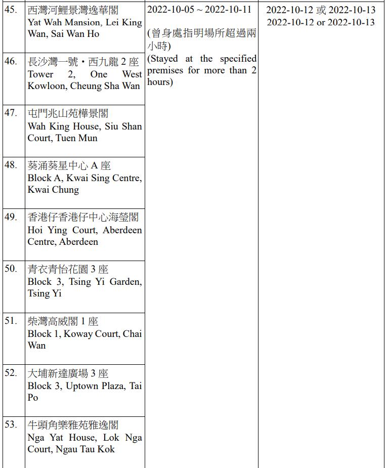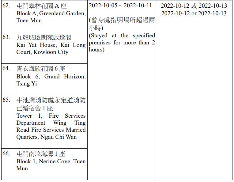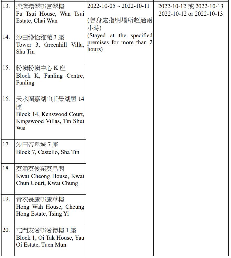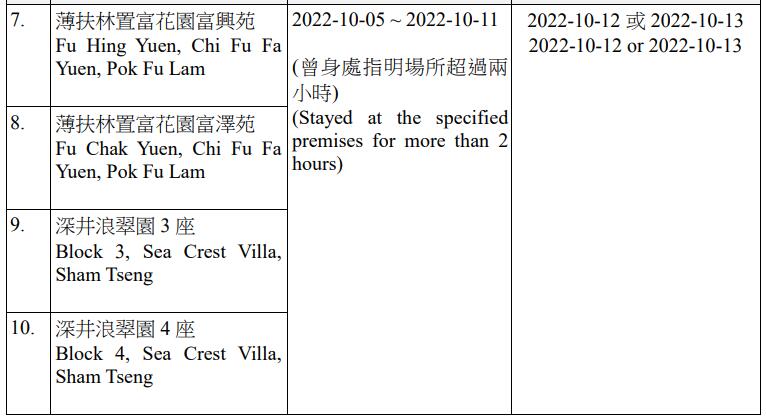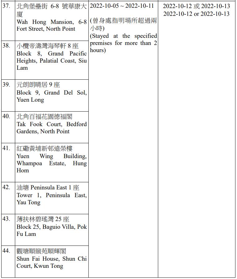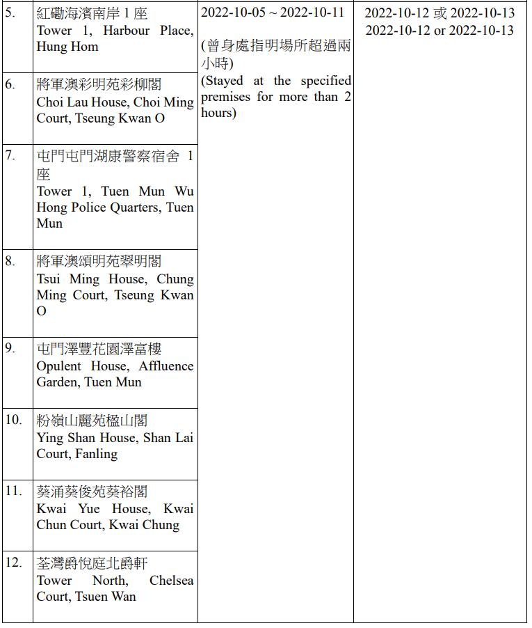 因應多宗陽性檢測個案,以及採集到檢測呈陽性的污水樣本,港府今晚(11日)就強制檢測公告刊憲,要求於指定期間曾身處76個指明地方的人士,須於10月12日或10月13日接受核酸檢測,包括深井碧堤半島7座、將軍澳廣明苑廣盈閣、元朗屏欣苑屏彥閣、火炭禾上墩街18號彩禾苑、紅磡海濱南岸1座、將軍澳彩明苑彩柳閣、屯門屯門湖康警察宿舍1座、將軍澳頌明苑翠明閣、屯門澤豐花園澤富樓、粉嶺山麗苑楹山閣等。