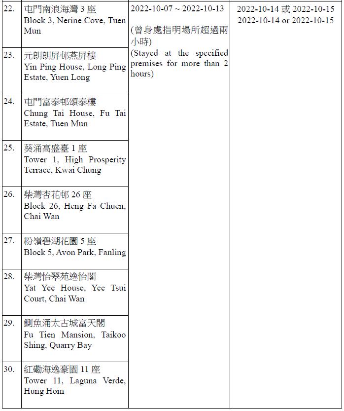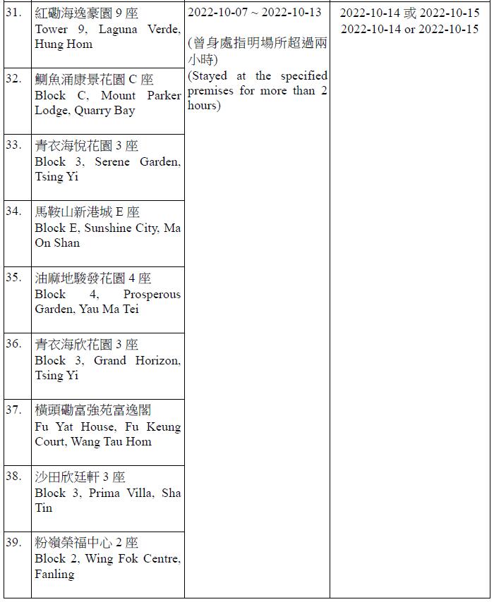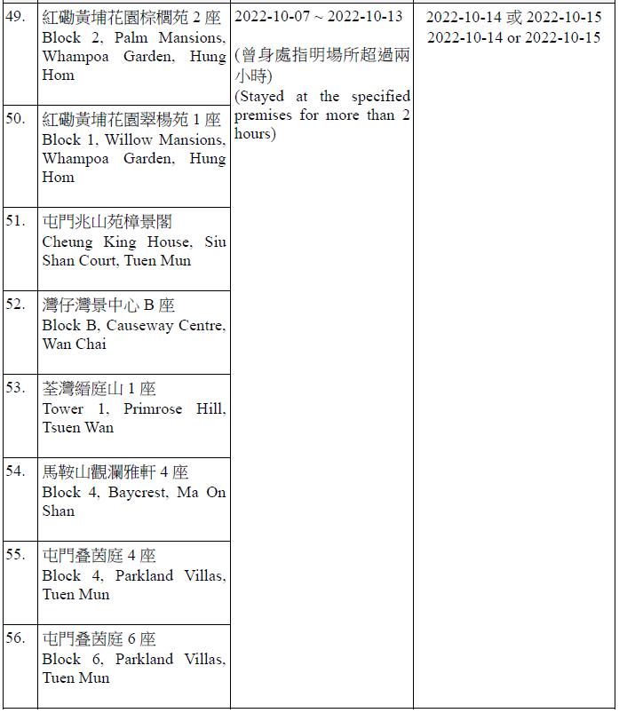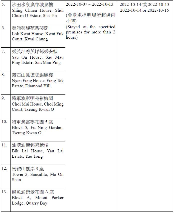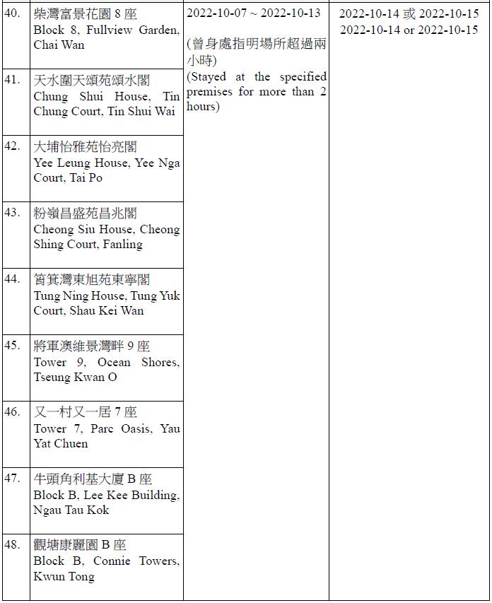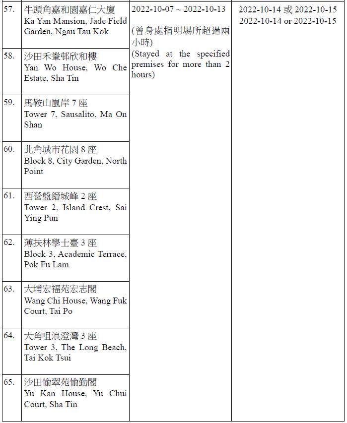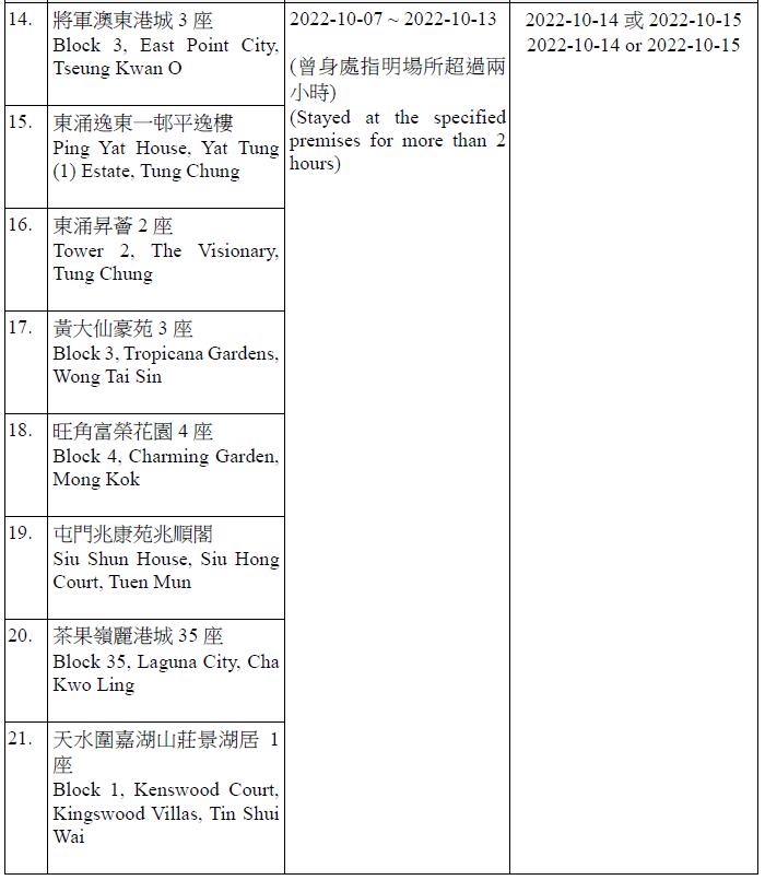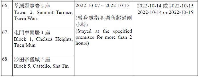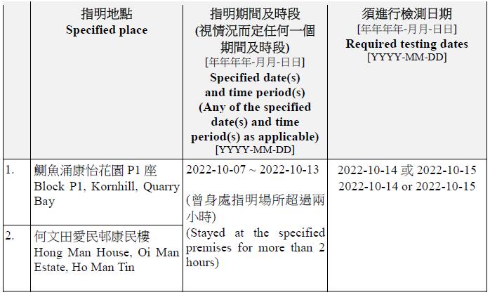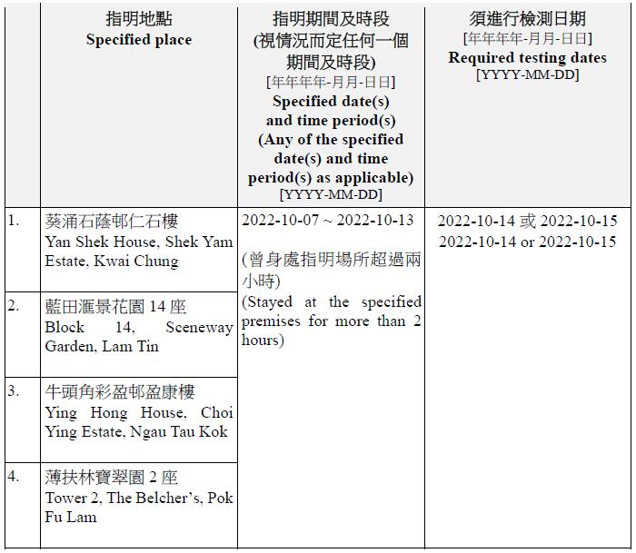 因應多宗陽性檢測個案,及採集到檢測呈陽性的污水樣本,港府今晚(13日)就強制檢測公告刊憲,要求於指定期間曾身處75個指明地方的人士,須於10月14日或10月15日接受核酸檢測,包括葵涌石蔭邨仁石樓、藍田滙景花園14座、牛頭角彩盈邨盈康樓、薄扶林寶翠園2座、沙田水泉澳邨城泉樓、葵涌葵馥苑樂葵閣、秀茂坪秀茂坪邨秀安樓、鑽石山鳳德邨銀鳳樓、將軍澳彩明苑彩梅閣、將軍澳富寧花園5座等。