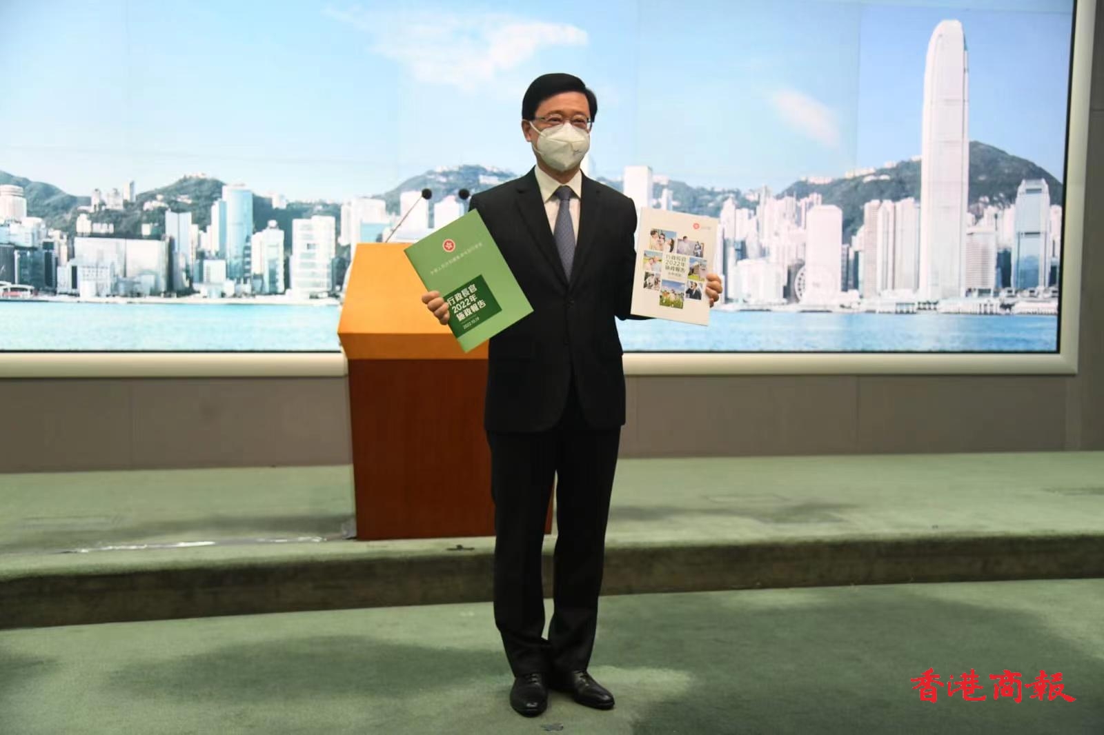 李家超又展示《施政報告》的封面,指知道大家很關心明日公布的《施政報告》,今次的封面選用綠色,代表希望、生命力及和諧穩定。並指在《施政報告》的不同範疇下定立了很多政策措施,亦會有《政策措施》篇章,令大家可以跟進在《施政報告》下其他領域一系列的政策措施。