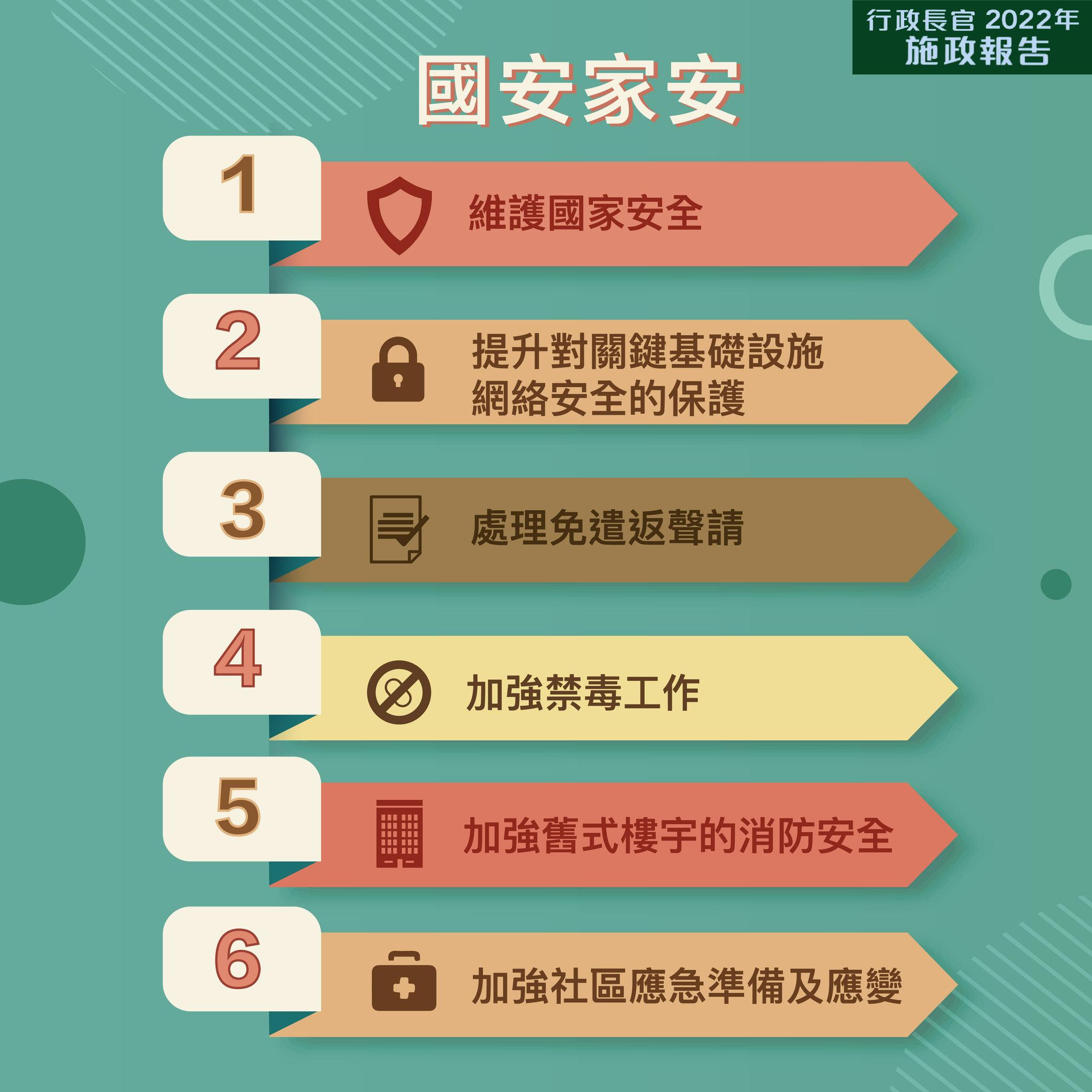 在「國安家安」方面,包括有加強執法和情報工作、積極做好推展基本法23立法工作、加強國家安全教育和宣傳;提升對關鍵基礎設施網絡安全的保護 ;加強禁毒工作。「更生同行」方面,為在囚人士提供更生服務,當中懲教署將與香港都會大學簽訂備忘錄,為希望繼續進修的在囚人士提供更全面的支援。