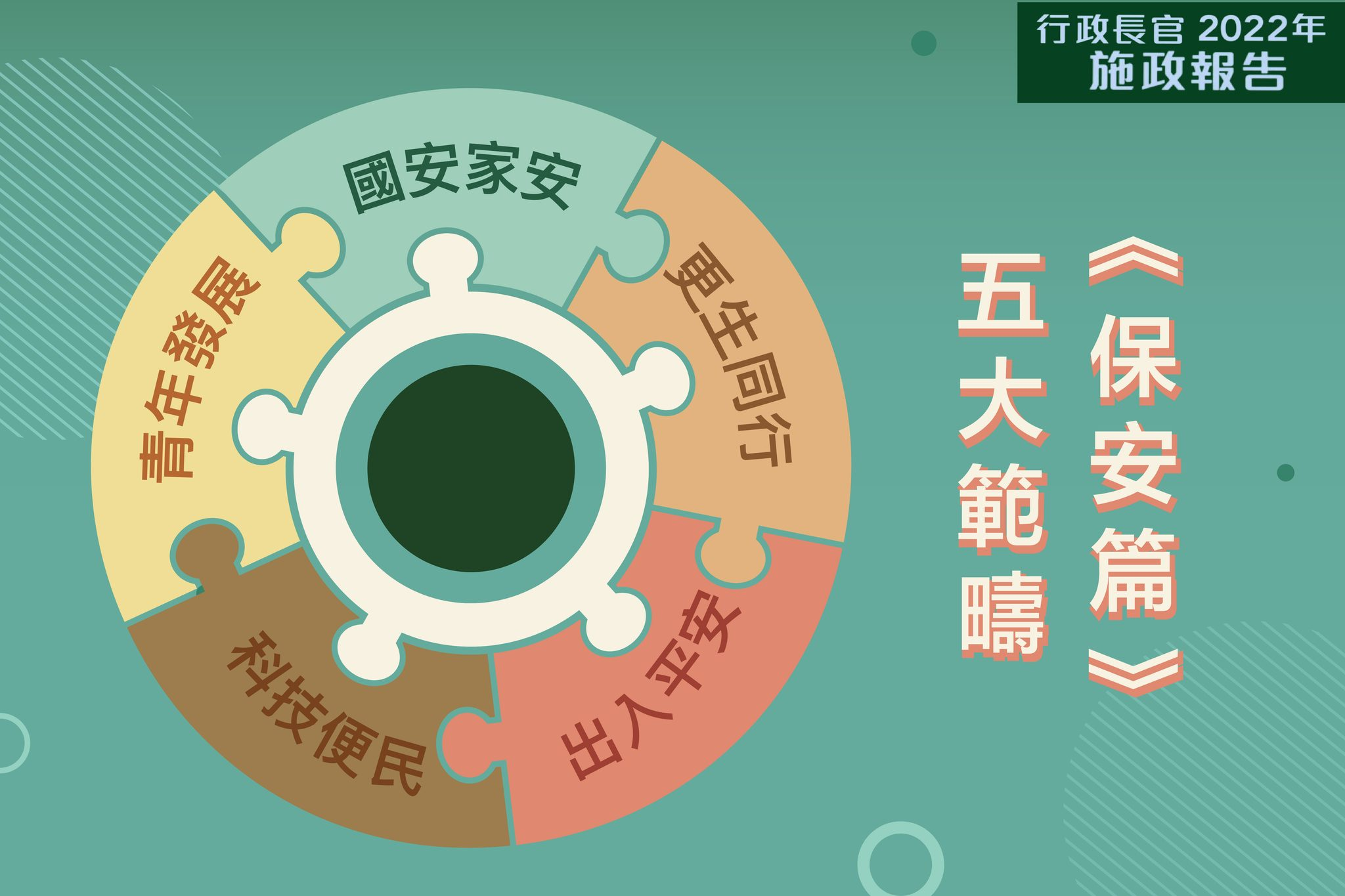 鄧炳強說,在這份施政報告裡,涉及保安局的措施可分為五大範疇,分別是「國安家安」、「更生同行」、「出入平安」、「科技便民」以及「青年發展」,鄧炳強更在社交專頁內把資訊圖列出了每個範疇的重點,希望市民更清晰了解相關政策措施。
