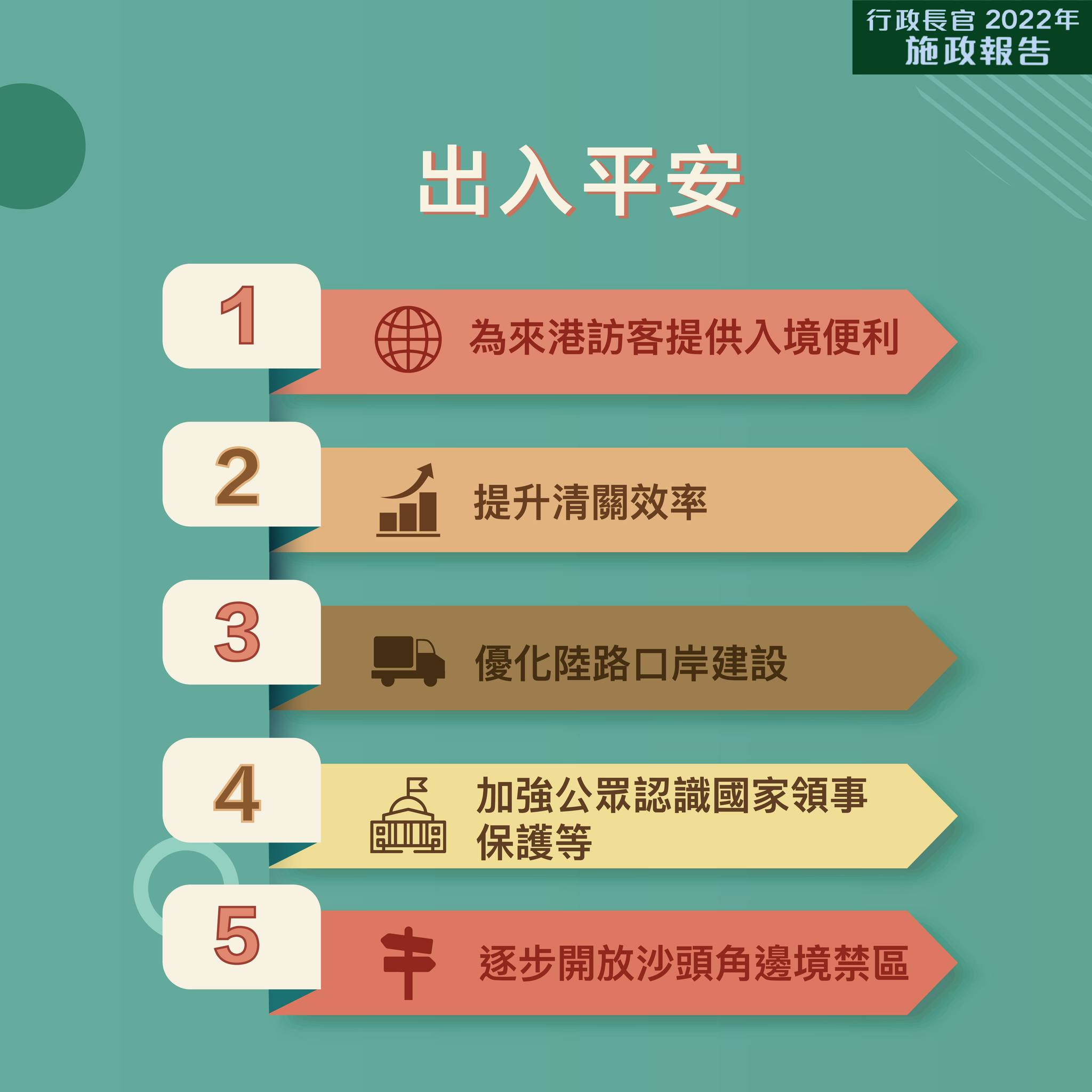 「出入平安」方面,分別是為來港訪客提供入境便利,會檢討「為來港參與指定界別短期活動的訪客提供入境便利先導計劃」、檢視不同國家或地區人士來港的簽證要求;優化陸路口岸建設,推展皇崗口岸重建工作、在規劃新口岸時研究採用「一地兩檢」及「合作查驗、一次放行」的安排;逐步開放沙頭角邊境禁區。