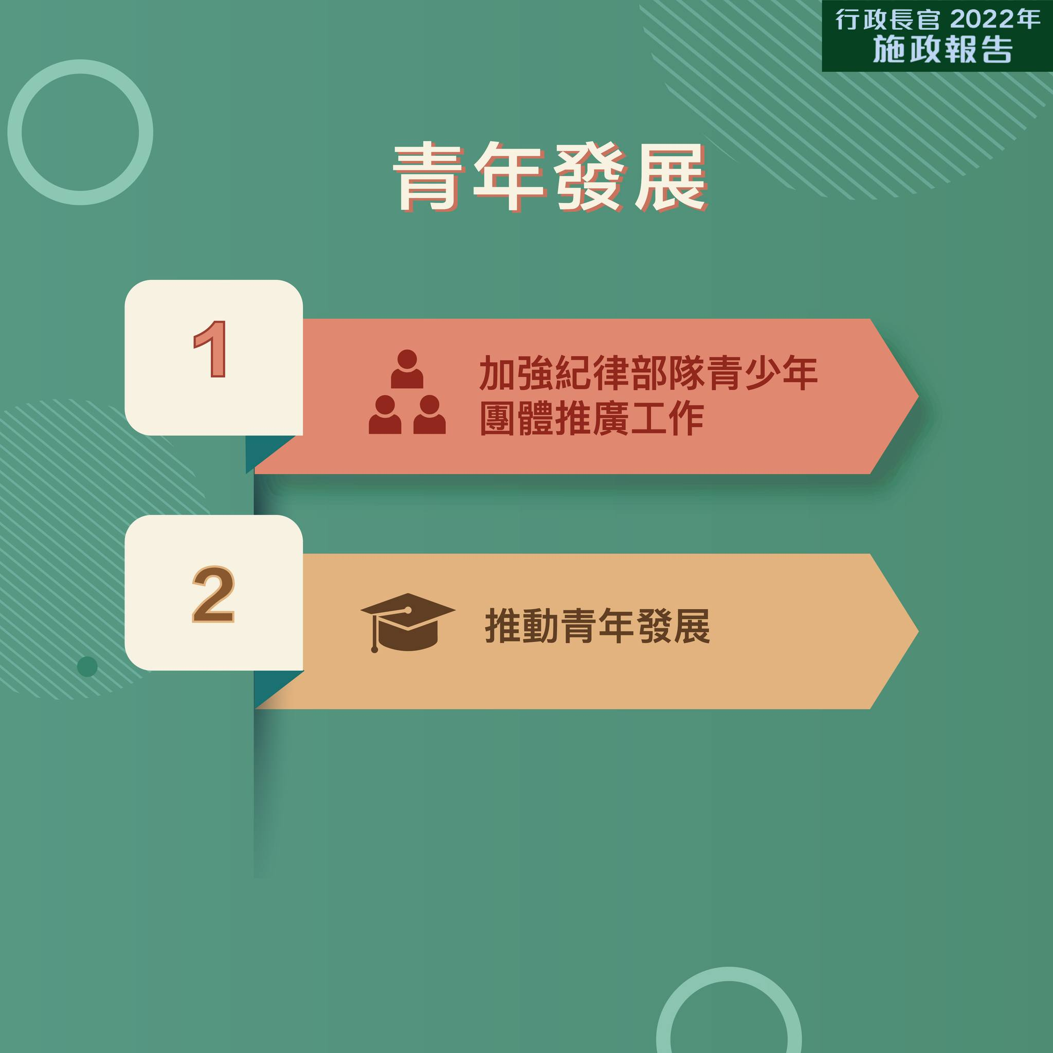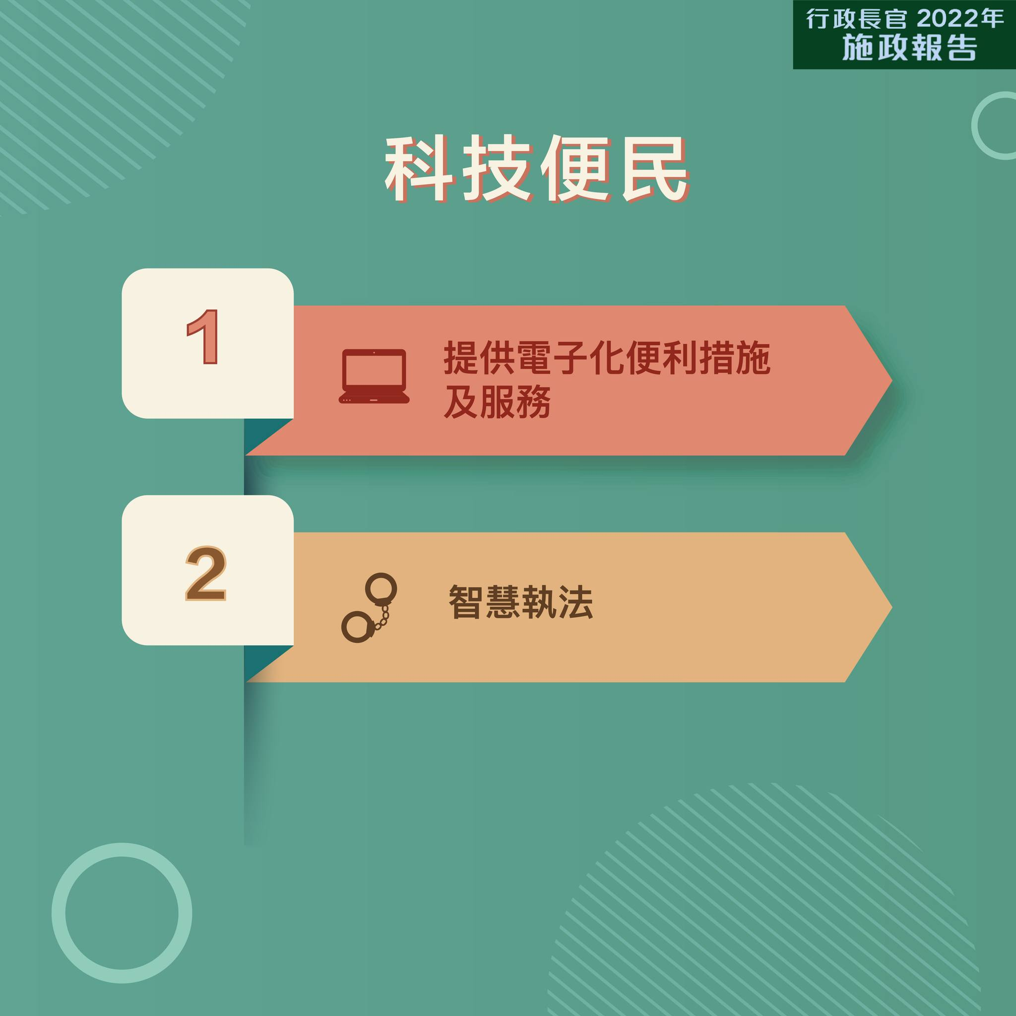 「科技便民」方面,當局會着力建設智慧政府,善用創新科技為市民提供更便利的服務,提升紀律部隊執法能力。而在「青年發展」方面,將加強紀律部隊青少年圑體推廣工作。