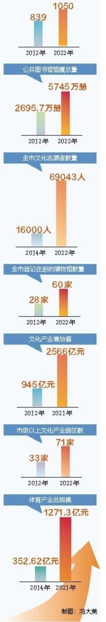 黨的十八大以來,深圳文體旅遊事業和產業發展突飛猛進全市各類公共圖書館(室)、自助圖書館合計:2012年:639+200=8392022年:744+306=1050製圖:馮大美