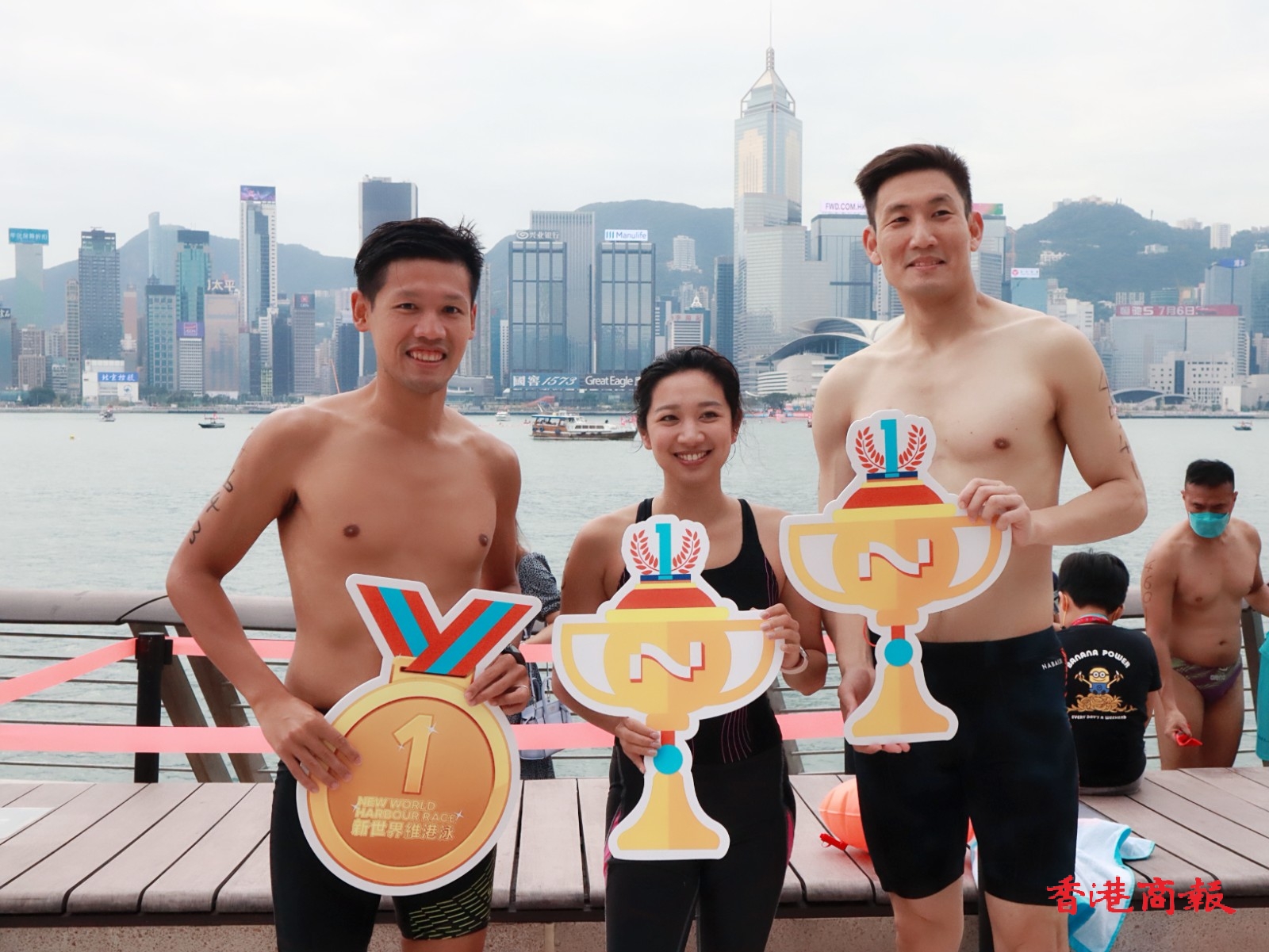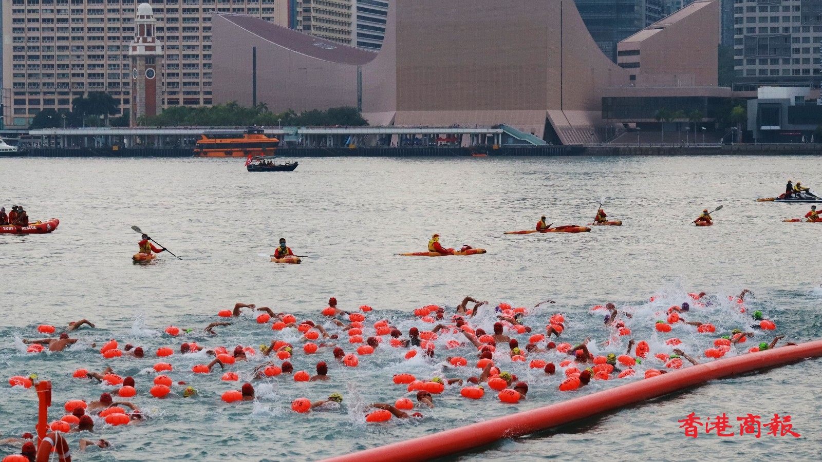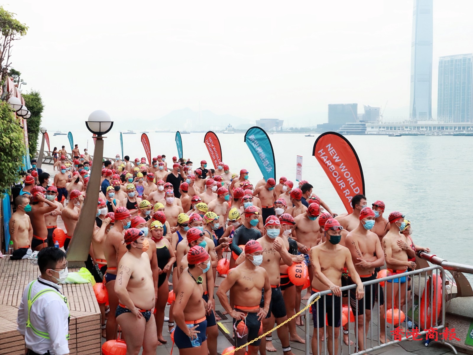 由游泳總會主辦的年度體壇盛事「新世界維港泳」今早(23日)舉行,本屆合共約有1500名泳手參賽。約7時05分,競賽組選手首先出發,男子組冠軍為港隊郭俊希,以大約14分25秒衝線,女子組冠軍則由黃靖琳奪得。