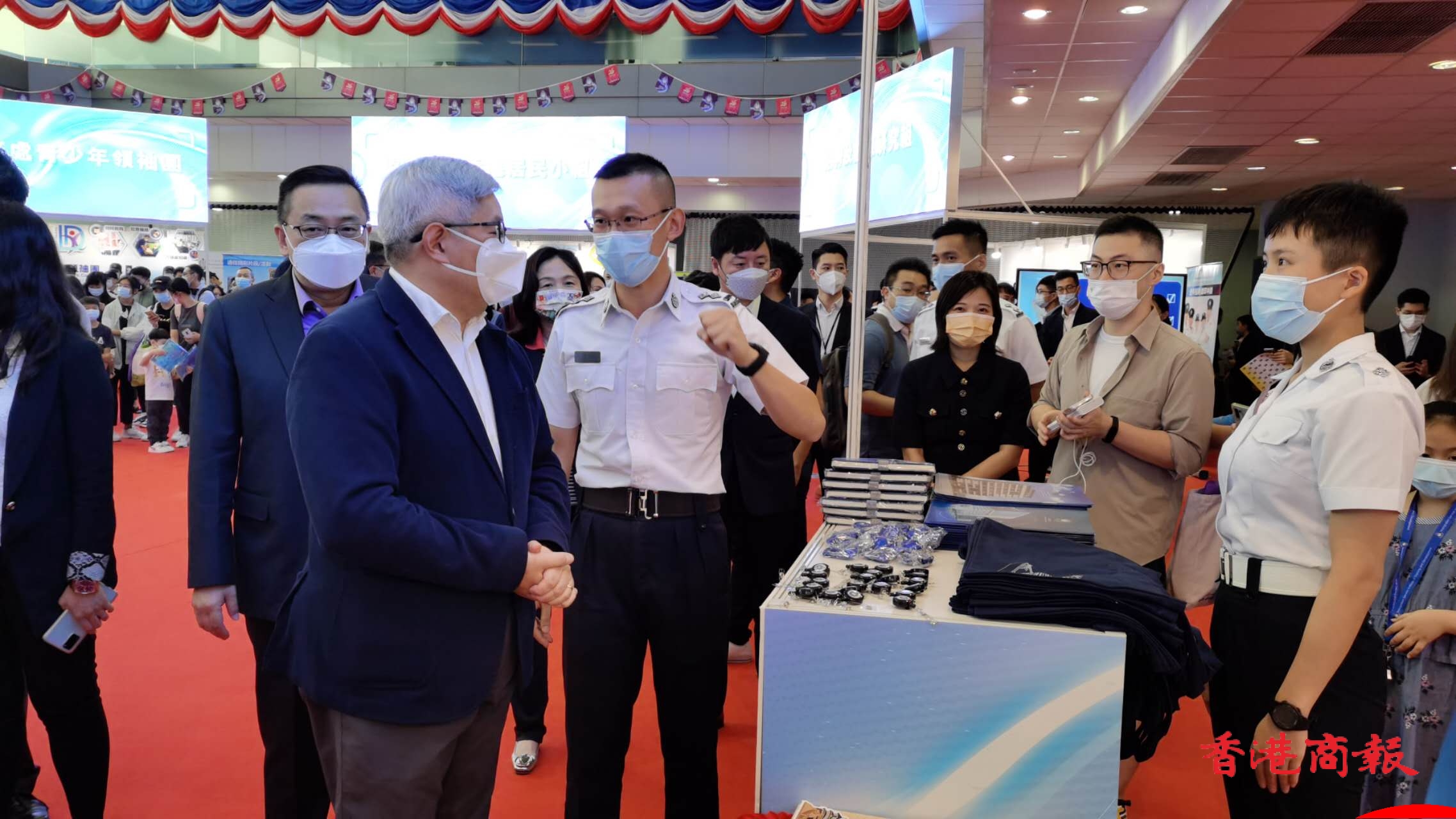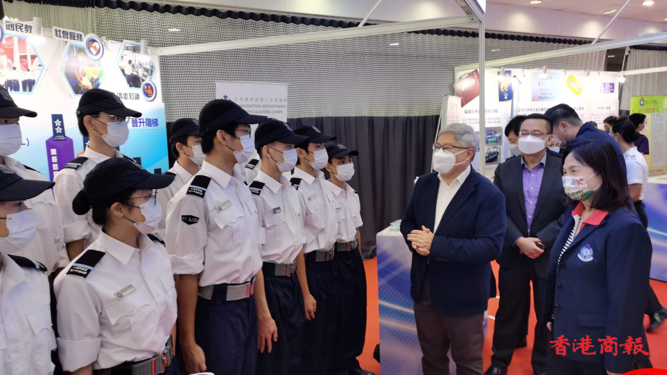 入境處搞開放日,作為主人家的現任處長區嘉宏當然有到場,他先到不同的攤位了解情況,和同事們交談拍照,然後特地到了青少年領袖團的攤位前,和學生們聊天交流。他特別提到,二十大期間,總書記習近平多次強調「青年強,則國家強」,所以入境處方十分重視青年工作,希望能通過紀律部隊的訓練,培養青年正向思維和正確的國家觀念。