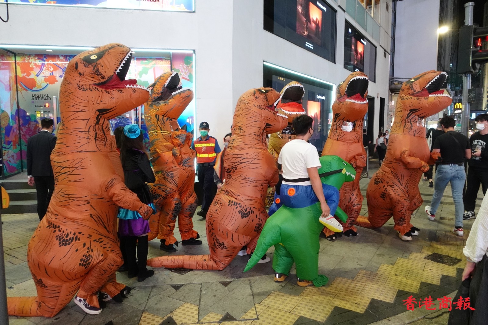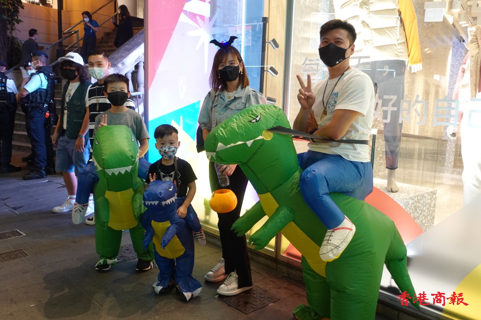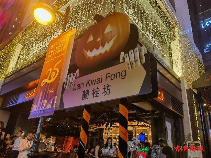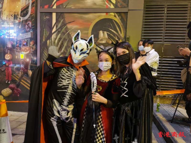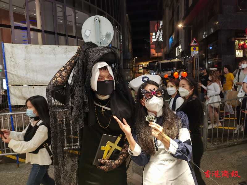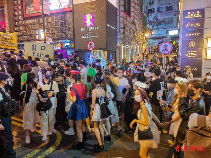 儘管今日恰逢工作日,香港也掛起三號風球,但酒吧聖地蘭桂坊喧囂依舊。萬聖節氣氛未減,市民穿上各種服飾,「扮鬼扮馬」有序暢聚蘭桂坊。(記者 木子 羅璇攝)