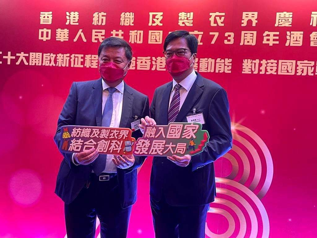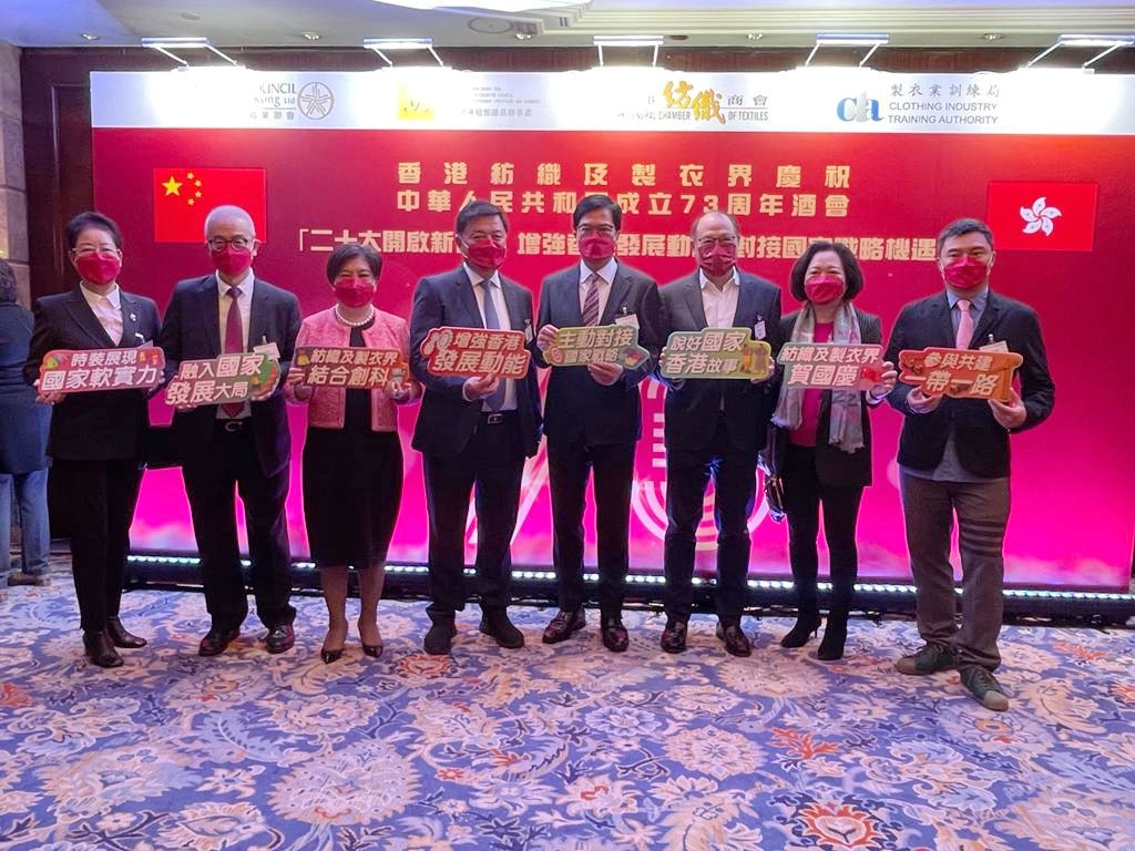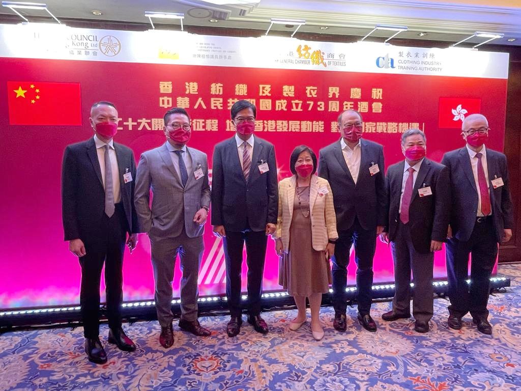 香港紡織業聯會、香港紡織商會、立法會陳祖恆議員辦事處和製衣業訓練局今日(31日)舉辦題為「二十大開啟新征程、增強香港發展動能、對接國家戰略機遇」的慶祝中華人民共和國成立73周年酒會。署理財政司司長黃偉綸,立法會主席梁君彥,中聯辦經濟部貿易處署理負責人、二級巡視員閻永青,港區全國人大代表兼香港紡織業聯會會長陳亨利,立法會紡織及製衣界議員陳祖恆,香港紡織商會會長朱立夫、製衣業訓練局委員方淑君及香港紡織業聯會副會長羅正杰等擔任主禮嘉賓。