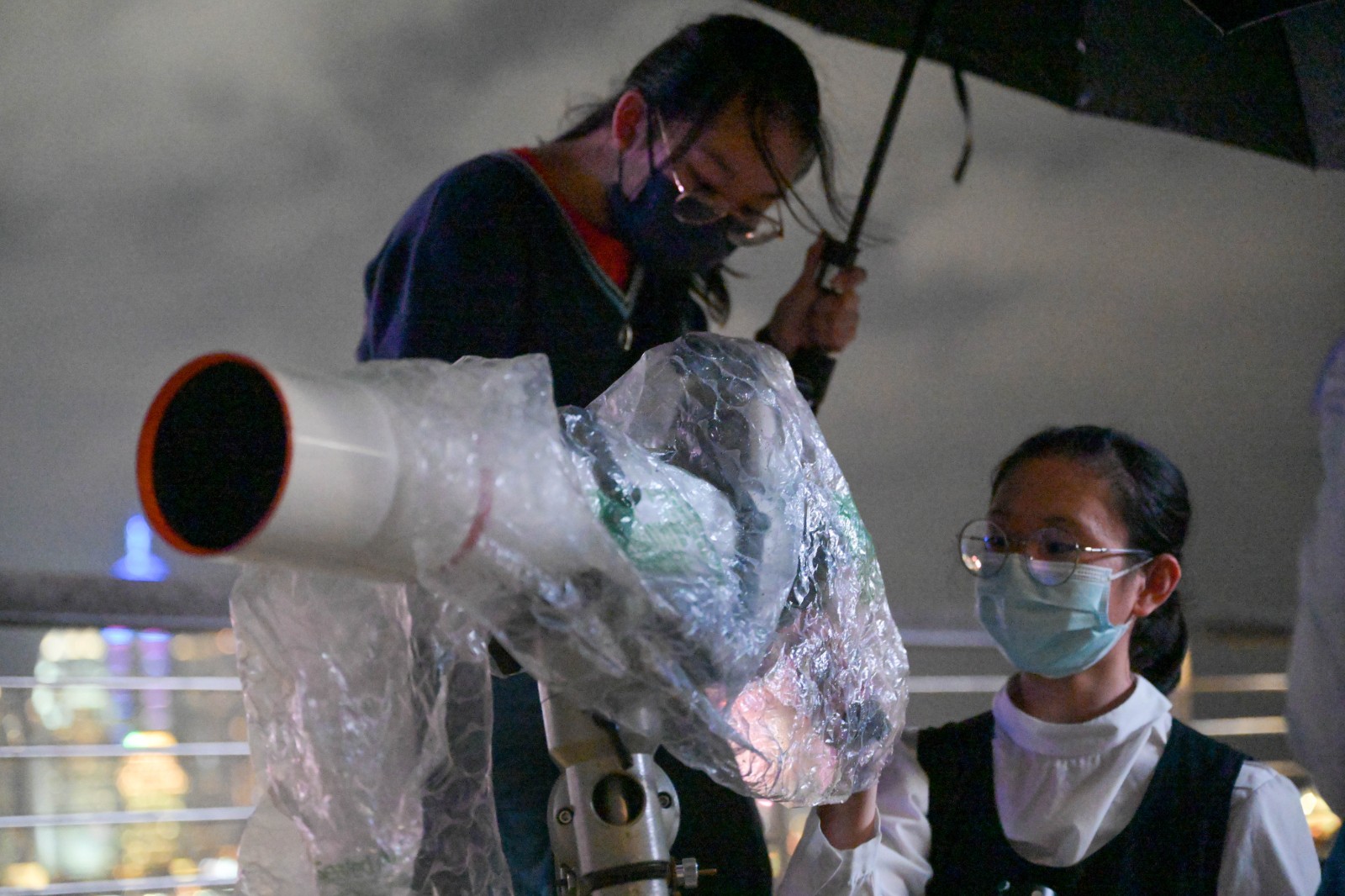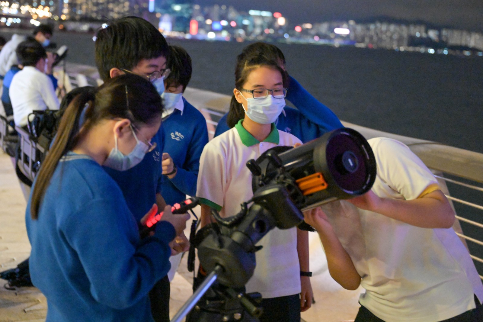 本港上空今晚(8日)同時出現千載難逢的「血月月全食」及「月掩天王星」天文奇觀。有市民在尖沙咀海傍架起三腳架,以相機及長焦鏡頭拍攝血月奇景;亦有天文愛好者帶備天文望遠鏡到海傍,以便觀看今次難得一見的天文現象。