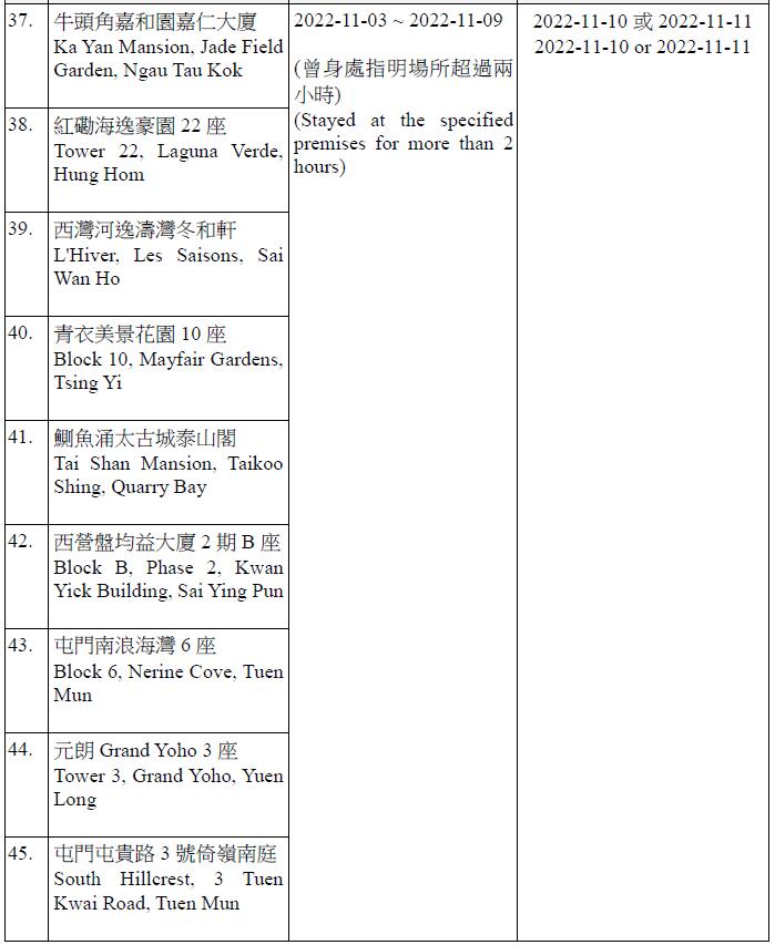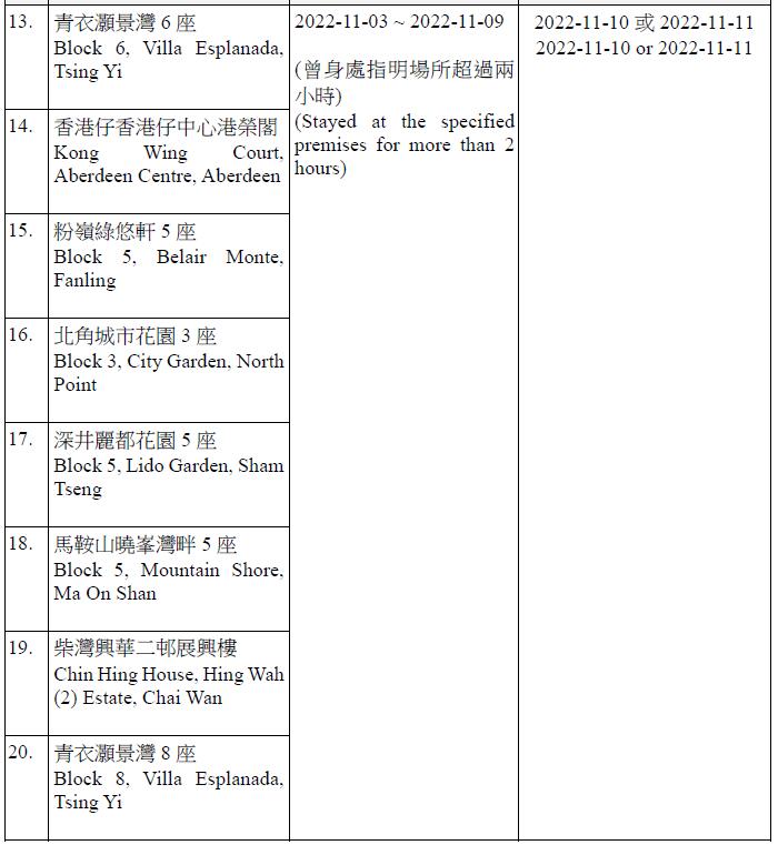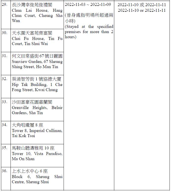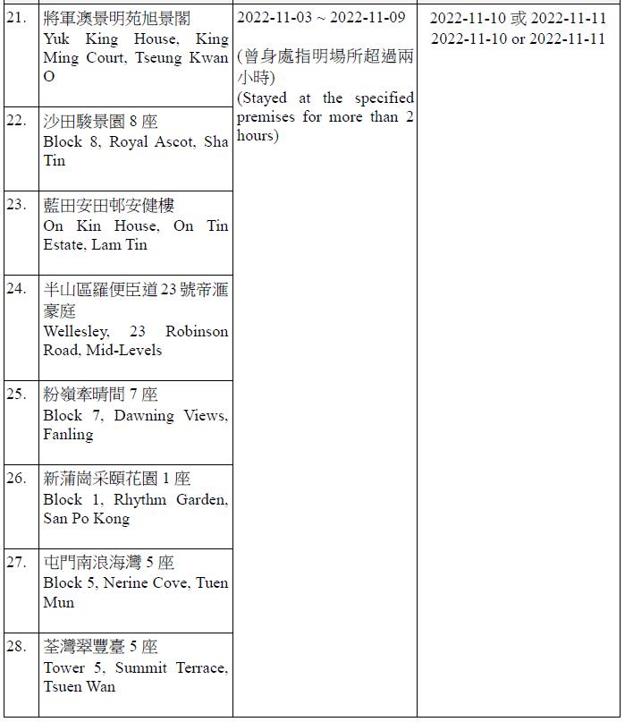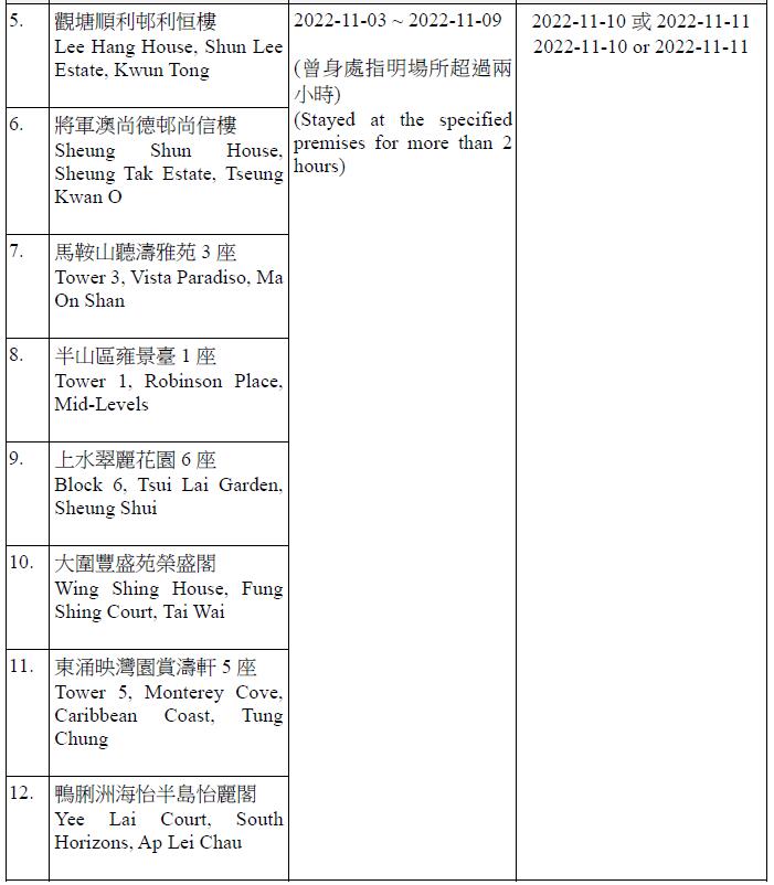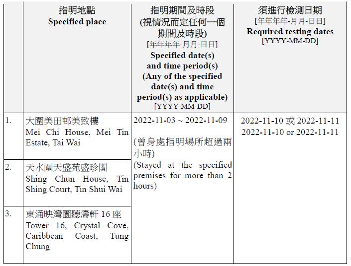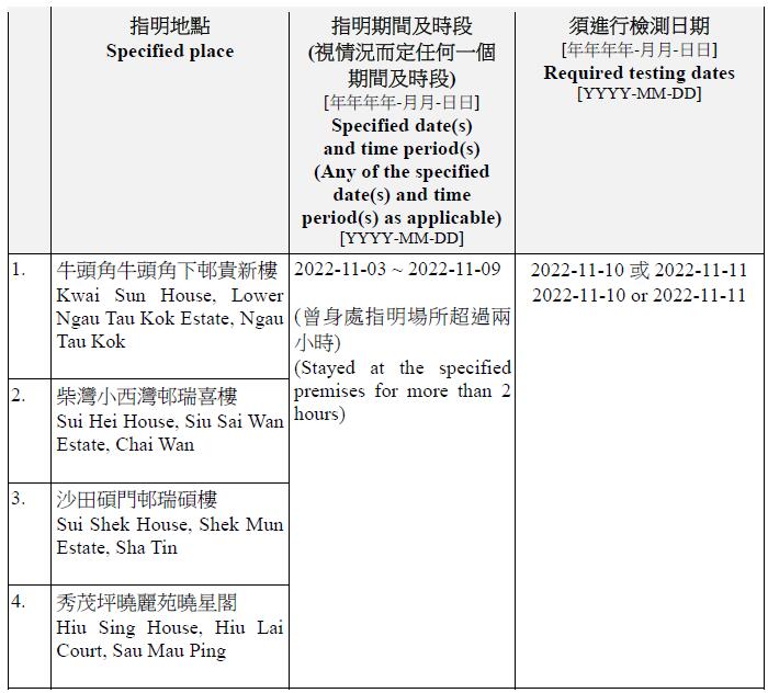 因應多宗陽性檢測個案,及採集到檢測呈陽性的污水樣本,港府9日晚就強制檢測公告刊憲,要求於指定期間曾身處以下48個指明地方的人士,須在11月10日及11日接受核酸檢測,包括牛頭角牛頭角下邨貴新樓、柴灣小西灣邨瑞喜樓、沙田碩門邨瑞碩樓、秀茂坪曉麗苑曉星閣、觀塘順利邨利恒樓、將軍澳尚德邨尚信樓、馬鞍山聽濤雅苑3座、半山區雍景臺1座、上水翠麗花園6座、大圍豐盛苑榮盛閣等。