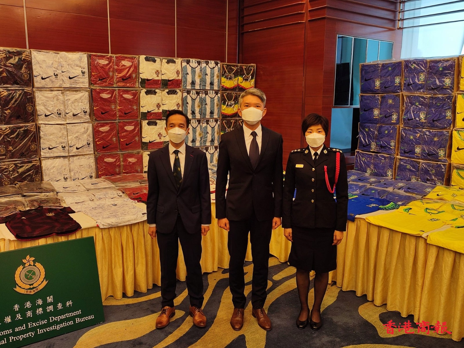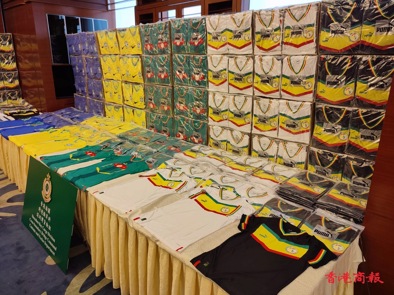 世界盃即將在卡塔爾舉行,海關留意到本港以至世界各地對世界盃相關產品尤其是不同國家隊球衣需求明顯增多,為打擊不法分子跨境轉運和銷售涉及世界盃相關的冒牌物品,近日加強執法行動,打擊相關侵權活動,在10月31日至11月10日在陸路口岸、本地物流公司和網站偵破20宗案件,緝獲逾10萬件冒牌球衣,總值約5000萬元,行動中共拘捕15人。