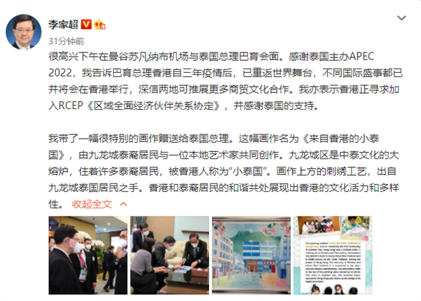 他在社交平台微博發文表示,很高興下午在曼谷蘇凡納布機場與泰國總理巴育會面。「感謝泰國主辦APEC 2022,我告訴巴育總理香港自三年疫情後,已重返世界舞台,不同國際盛事都已並將會在香港舉行,深信兩地可推展更多商貿文化合作。我亦表示香港正尋求加入RCEP《區域全面經濟夥伴關係協定》,並感謝泰國的支持。」