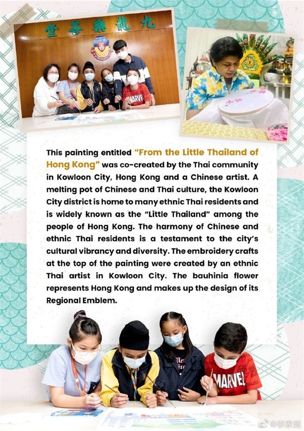 李家超表示,「我帶了一幅很特別的畫作贈送給泰國總理。這幅畫作名為《來自香港的小泰國》,由九龍城泰裔居民與一位本地藝術家共同創作。九龍城區是中泰文化的大熔爐,住着許多泰裔居民,被香港人稱為「小泰國」。畫作上方的刺繡工藝,出自九龍城泰國居民之手。香港和泰裔居民的和諧共處展現出香港的文化活力和多樣性。」