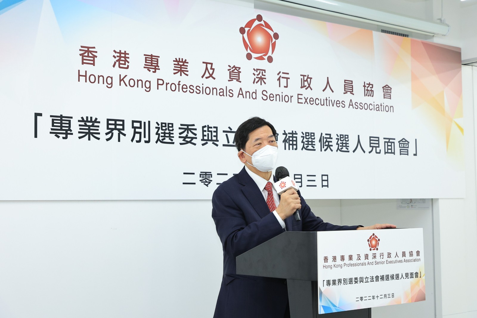 香港專業及資深行政人員協會(專資會)今日(3日)舉辦「專業界別選委與立法會補選候選人見面會」,邀請立法會補選6位候選人輪流發言作自我介紹及政綱總結,並就抽籤而定的議題發言,包括經濟、社會、民生等不同範疇,讓大眾更了解他們政綱內容及議政論政能力。活動亦邀請選舉委員會專業界別的委員參與,聽取候選人的見解及政治抱負。