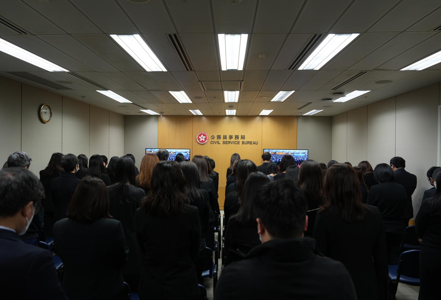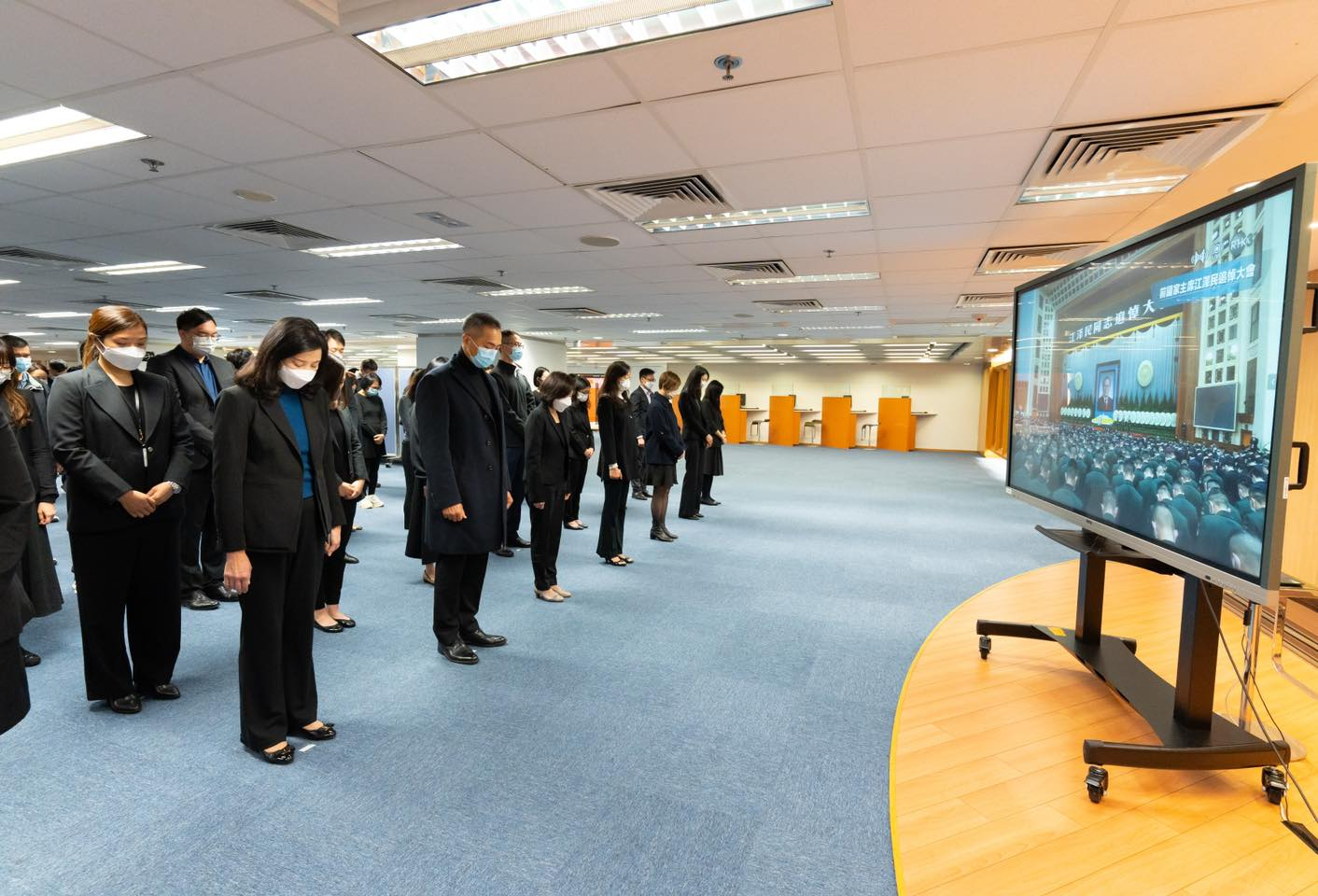 公務員事務局局長楊何蓓茵今日(6日)在社交平台發文表示,今早與公務員事務局常任秘書長及局方各級人員收看前國家主席江澤民的追悼大會直播,肅立默哀三分鐘。公務員學院人員則在北角政府合署院址參與默哀,向江澤民表達深切哀悼。