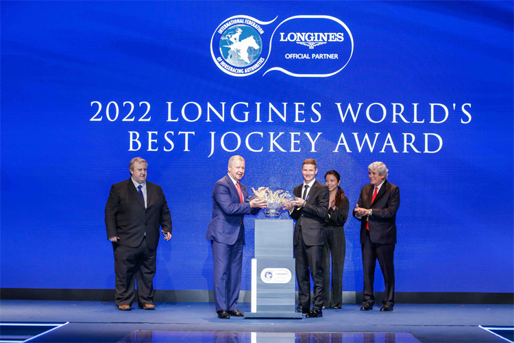 2022年浪琴全球最佳騎師獎得主麥道朗今年合共贏得全球百大一級賽排名榜上九項賽事,實至名歸。馬會行政總裁兼國際賽馬組織聯盟主席應家柏在晚宴上向麥道朗頒獎時表示︰「九年前,浪琴與國際賽馬組織聯盟攜手設立浪琴全球最佳騎師獎,以表揚世界級賽馬運動員的驕人成就,並向每年表現最出色的騎師致敬,表彰得獎者冠絕全球同儕的佳績。戴圖理、莫雅、布文等馬壇頂尖好手均曾獲此殊榮。」
