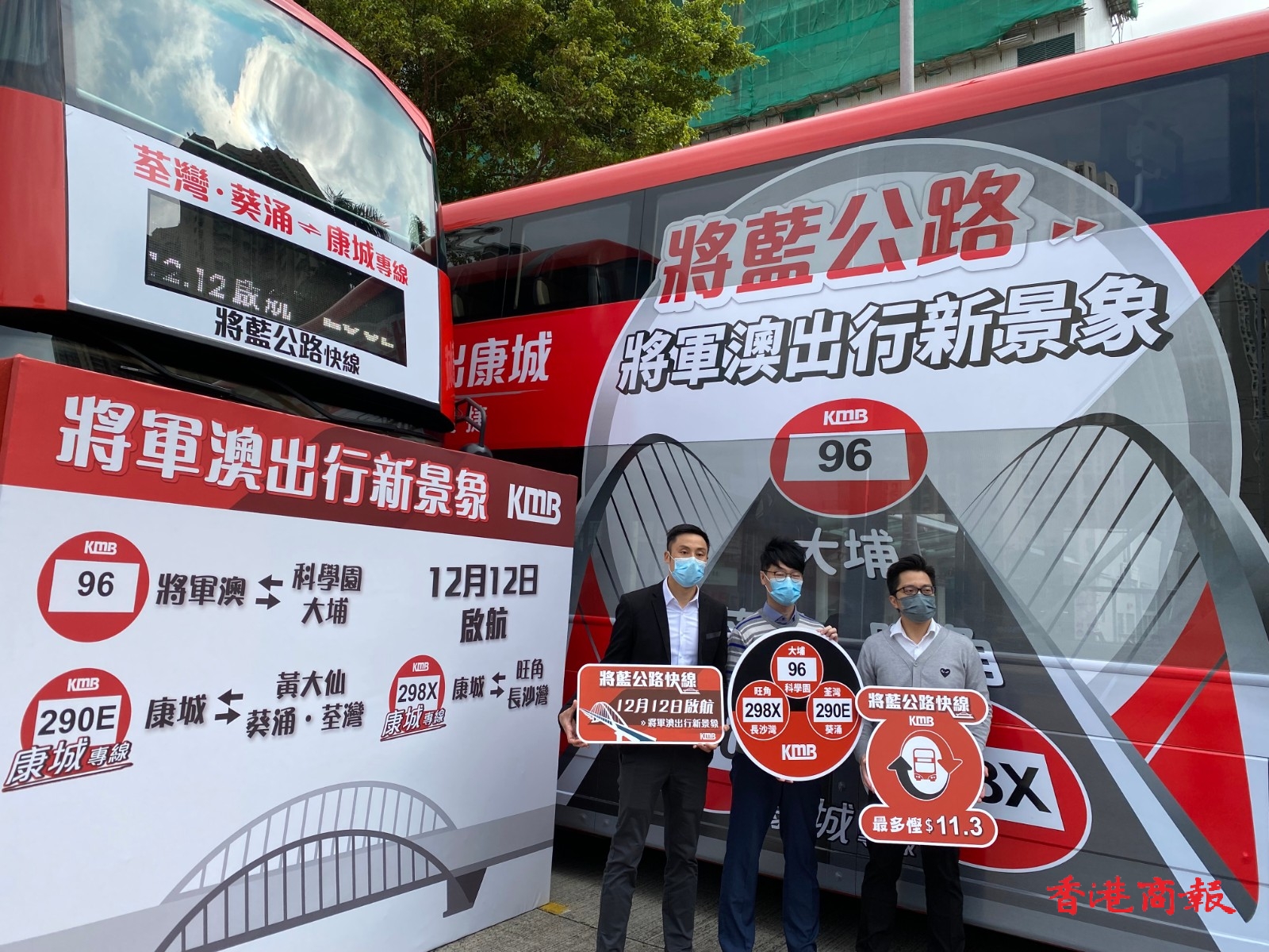 明日起,將軍澳區內將新增五條巴士路線,平日繁忙時間行經將藍隧道,來往將軍澳至大埔、荃灣、長沙灣及尖沙咀等地。運輸署預計通車後兩至三個月,安排四條巴士線改道將藍隧道。其中九巴將於明日開辦三條將藍公路快線,包括96線【將軍澳(康盛花園)來往大埔工業邨】、290E線【將軍澳工業邨來往荃灣西站】及298X線【坑口(北)(將軍澳醫院來往長沙灣(甘泉街)】。