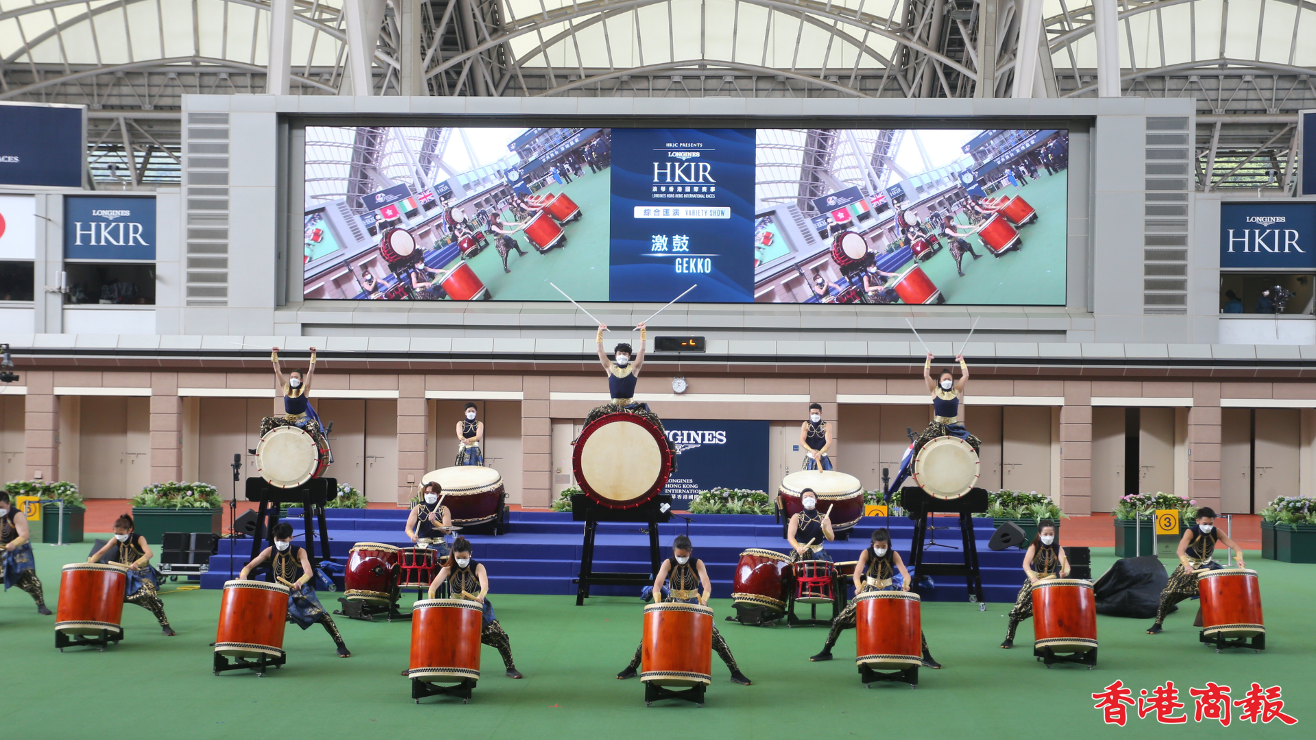 今日(11日)沙田馬場舉行2022香港國際賽日,開幕綜合匯演於上午11時30分在馬匹亮相圈舉行,打頭陣是來自本港的激鼓樂社上演太鼓表演,繼而就由著名歌手李克勤傾力獻唱多支名曲《紅日》、《飛花》及《球迷奇遇記》等,並帶動現場熾熱氣氛,為香港國際賽日揭開序幕。(記者 志誠 攝)
