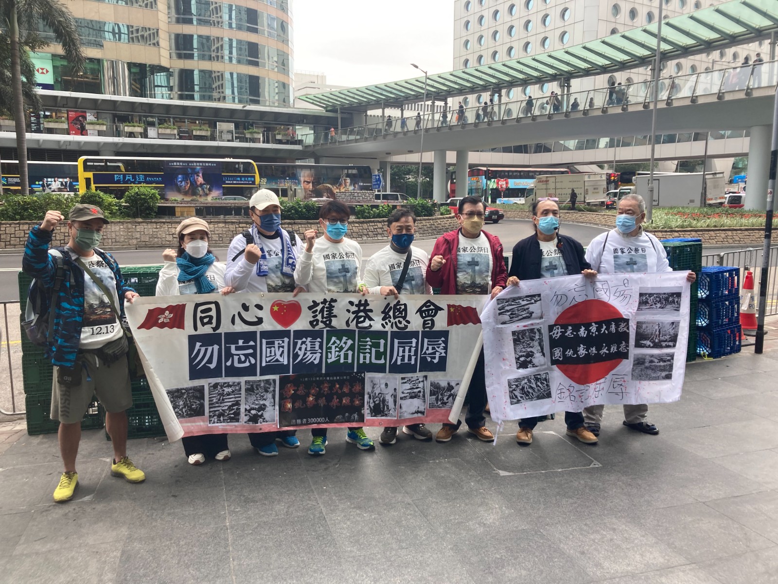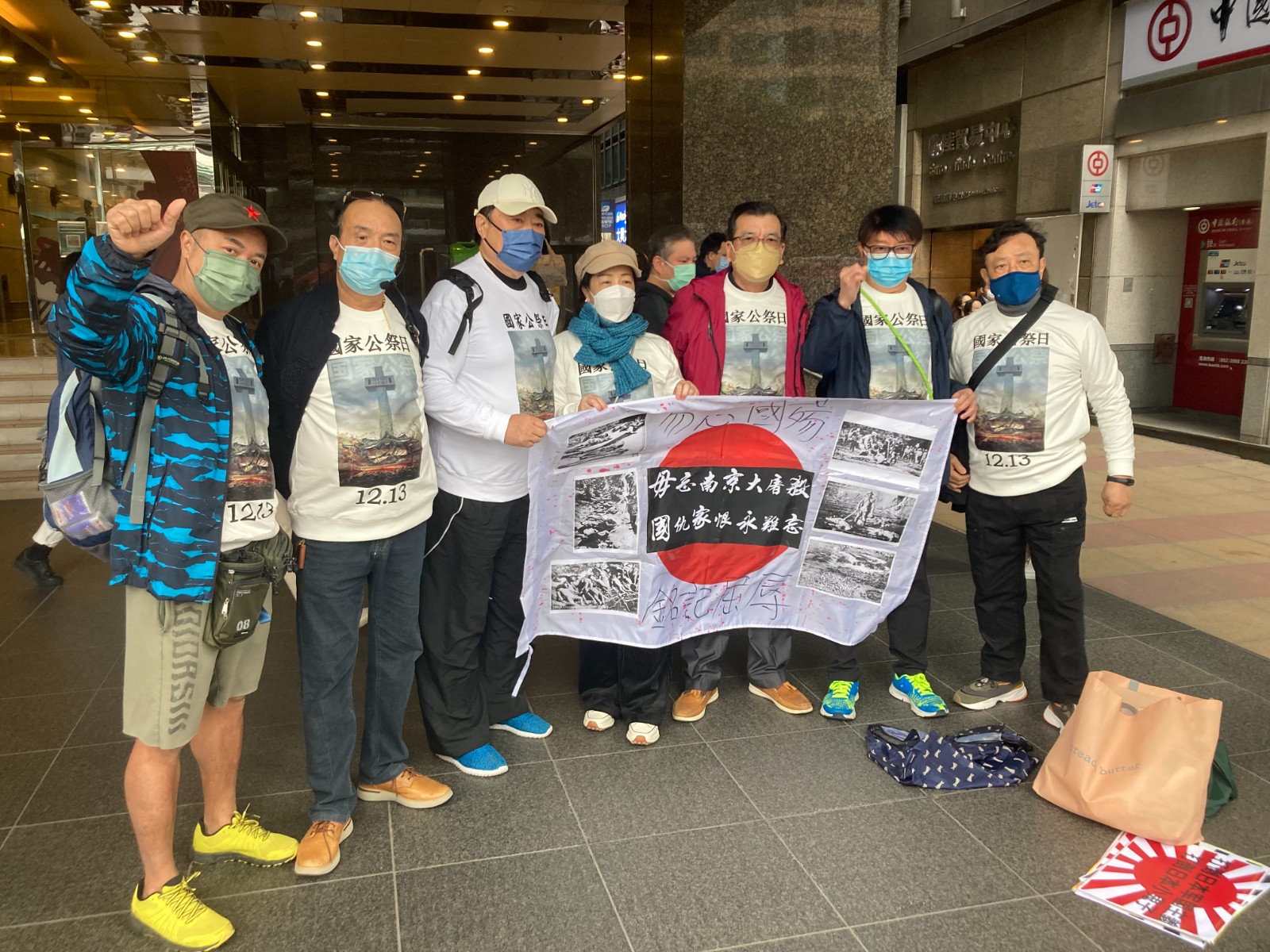 多位市民今早前往日本駐港總領事館抗議,他們高喊「勿忘南京大屠殺」、「打倒日本軍國主義復辟」、「中國人民憤怒了」等口號,並撕毀日本國旗。上午10時,有成員使用自製防空警報器,並默哀悼念南京大屠殺的死難者。