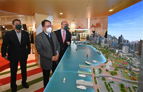 政務司司長陳國基(左二)在華懋集團執行董事兼行政總裁蔡宏興(左三)陪同下參觀展覽。