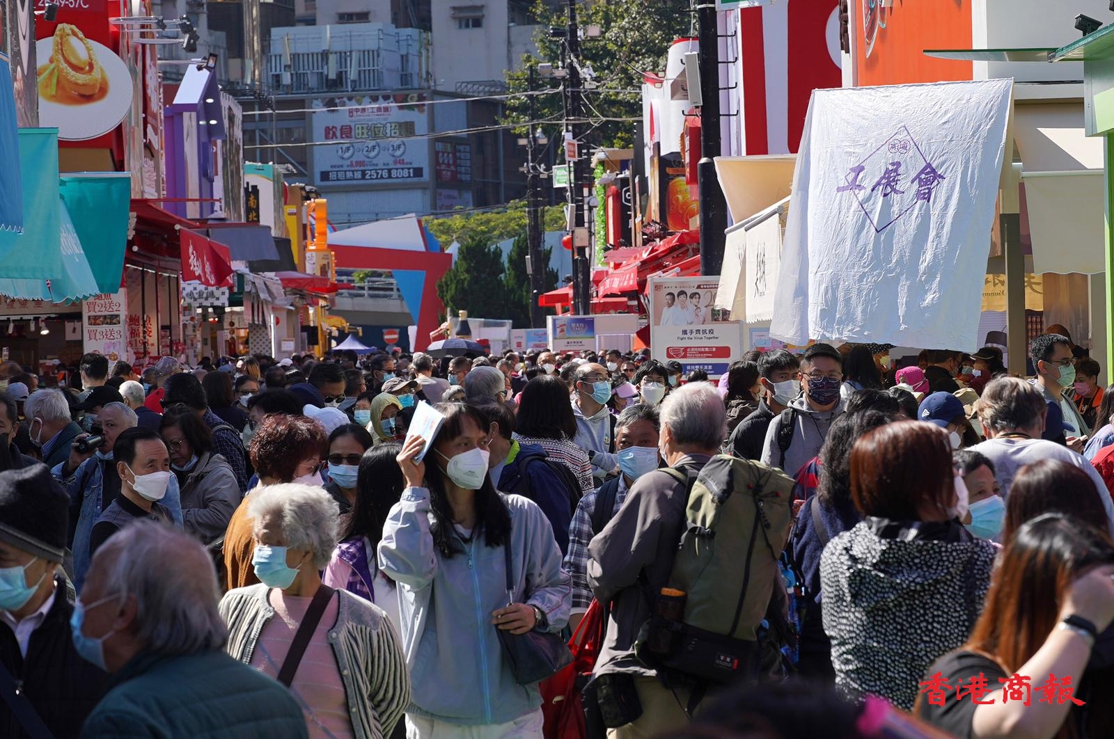 隨着政府進一步放寬多項防疫措施後,銅鑼灣維園工展會22日起恢復可以場內試食,適逢今日(25日)是聖誕長假期,工展會現場由中午起人流如鯽,有試食的路段更吸引人流聚集,水洩不通。參展檔商普遍認為人流已恢復疫情前水平,但消費力只回復約八成。大部分試食的市民均表示曾經確診,所以不再害怕除口罩。