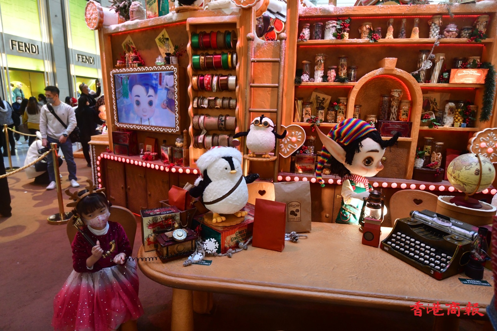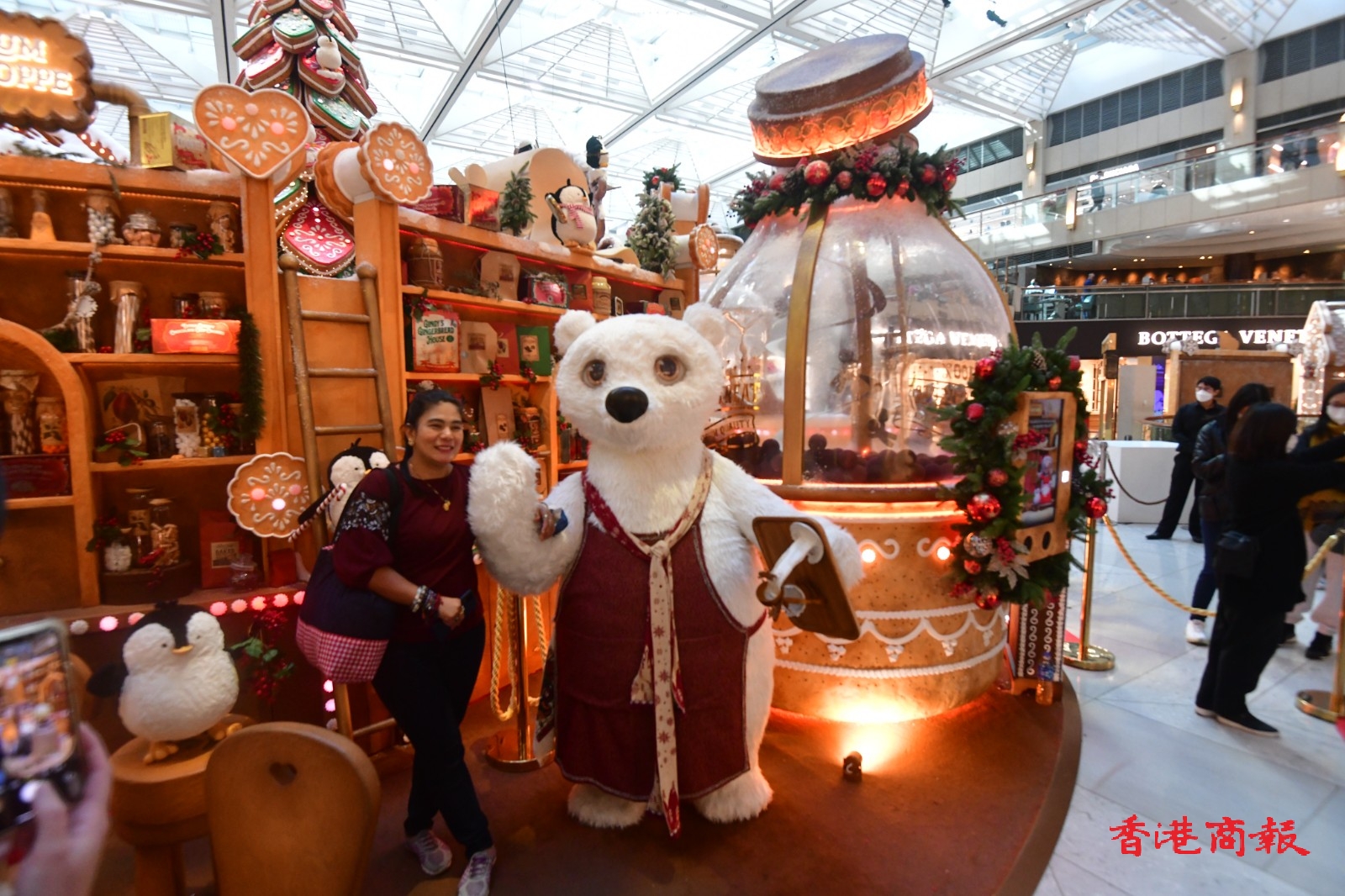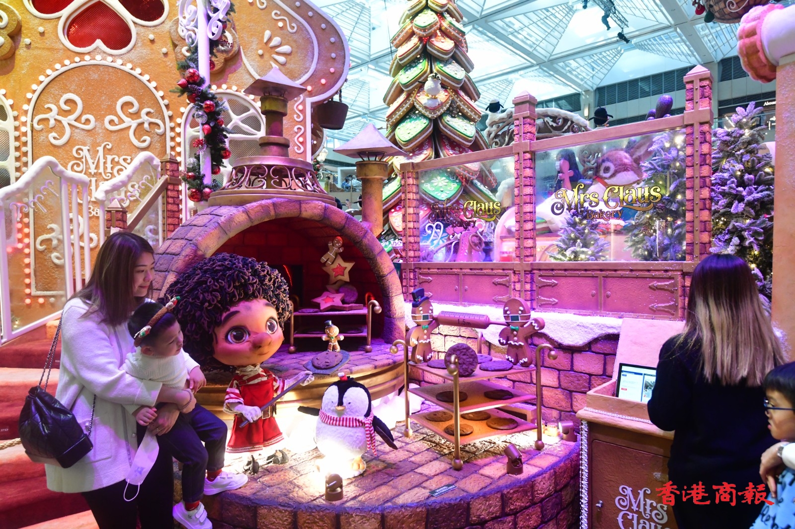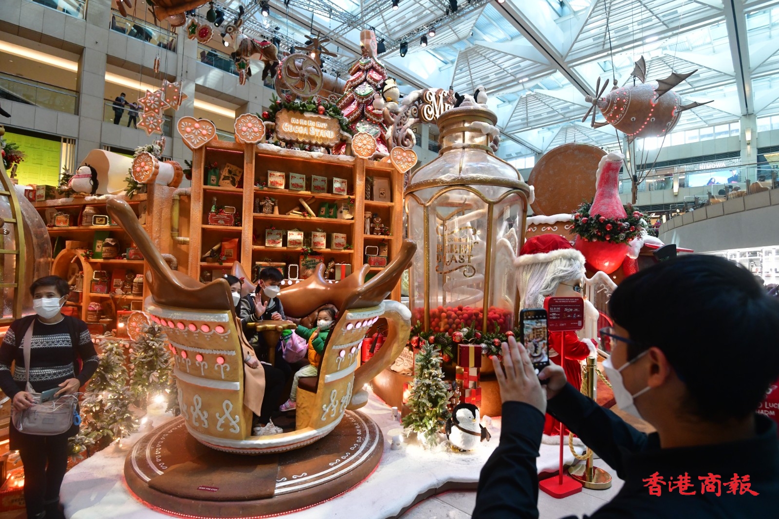 置地廣場中間放滿聖誕婆婆與精靈家族成員,除了薑餅人、企鵝、北極熊、馴鹿外,另有近80個聖誕助手分布於巨大薑餅屋內外;埸內設有多個景點,有茶壺大彈床、巨型曲奇聖誕樹,更有多個造型可愛的企鵝、薑餅人、熊仔等,在旋轉茶杯及曲奇蹺蹺板上跳上跳落,又或在火爐旁輕鬆一下,吸引一家大小度過一個「打卡」聖誕。(記者 崔俊良攝)