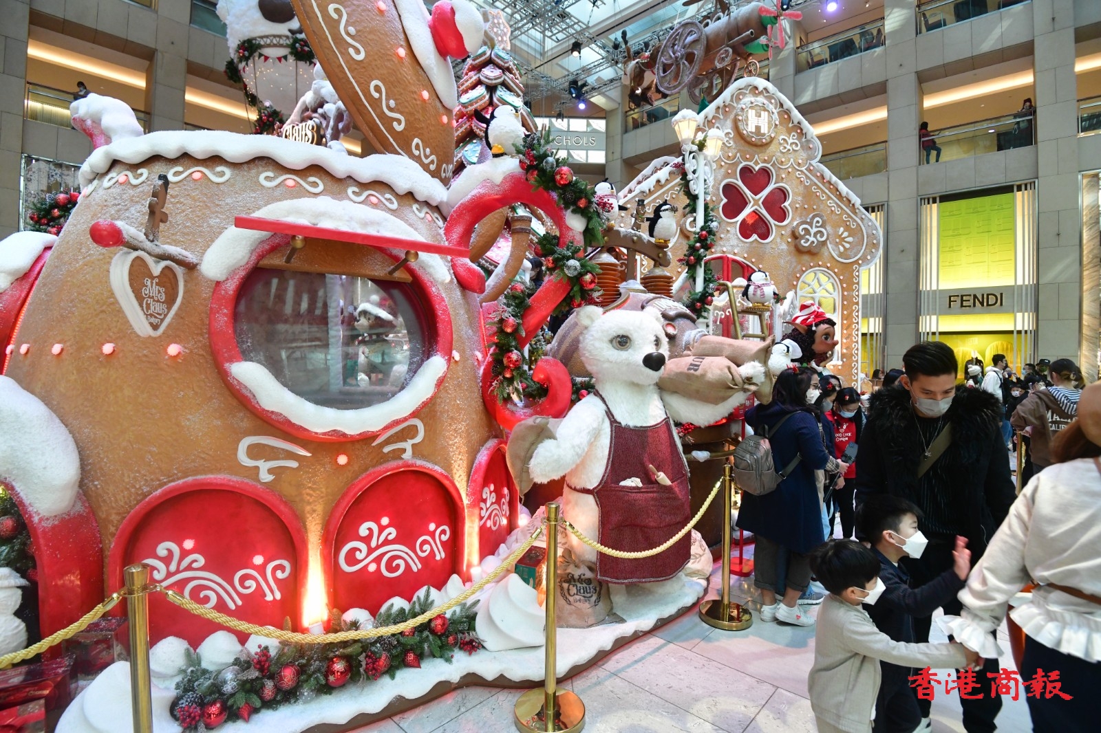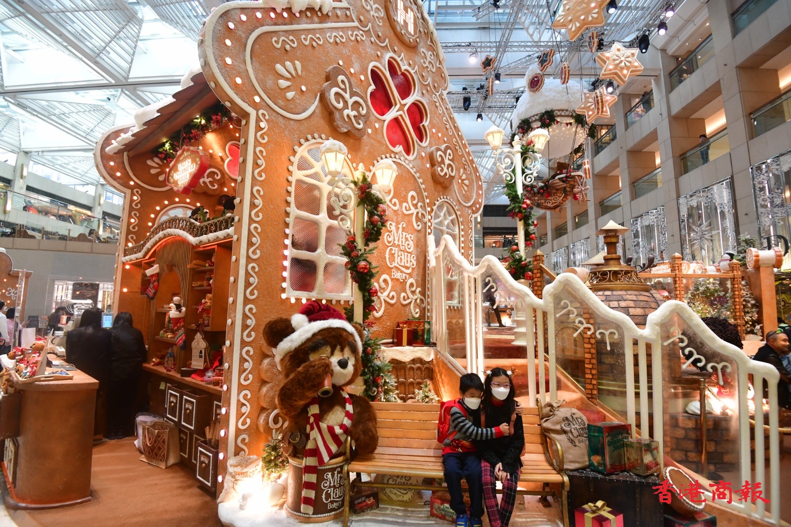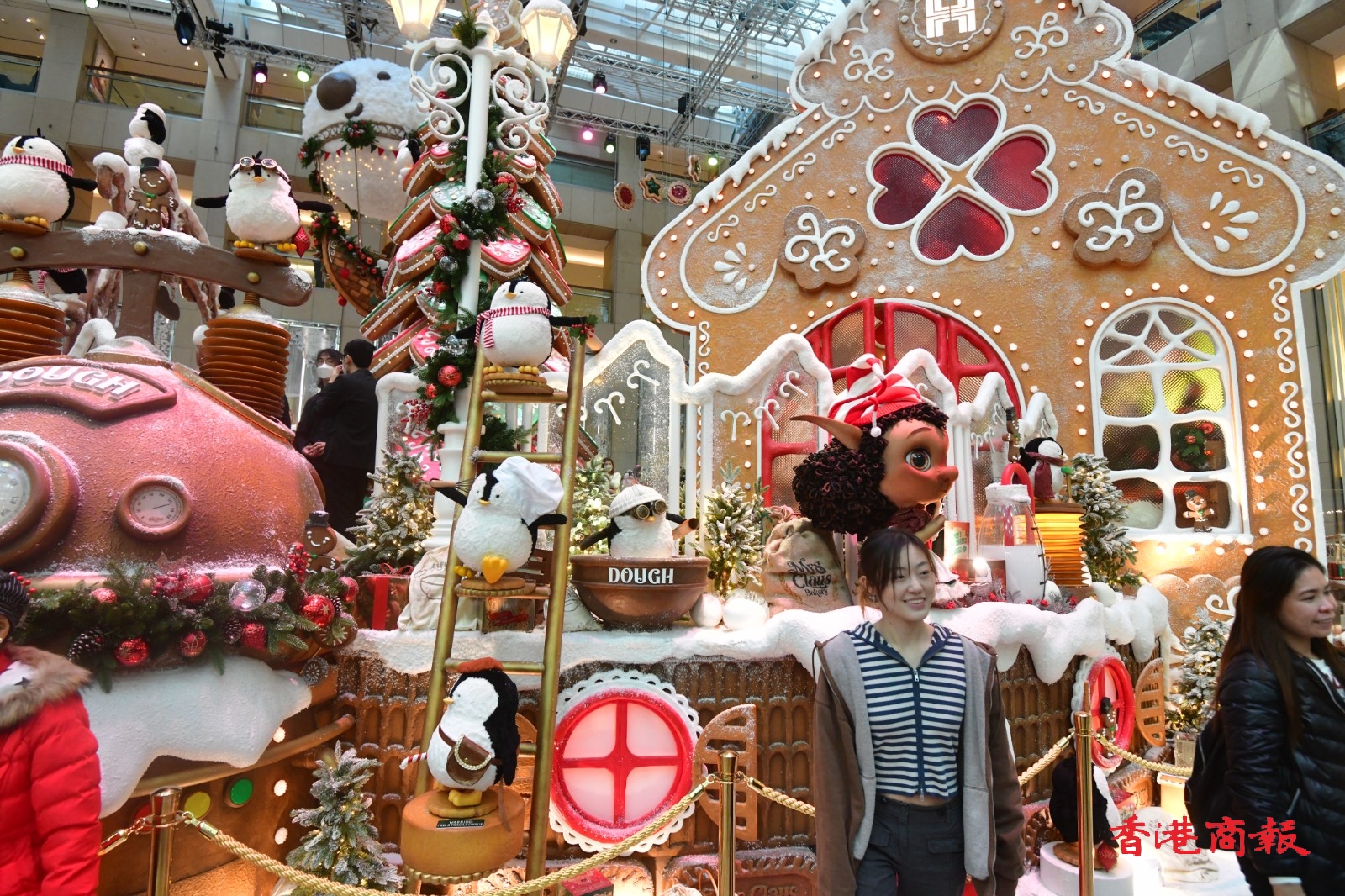 置地廣場中間放滿聖誕婆婆與精靈家族成員,除了薑餅人、企鵝、北極熊、馴鹿外,另有近80個聖誕助手分布於巨大薑餅屋內外;埸內設有多個景點,有茶壺大彈床、巨型曲奇聖誕樹,更有多個造型可愛的企鵝、薑餅人、熊仔等,在旋轉茶杯及曲奇蹺蹺板上跳上跳落,又或在火爐旁輕鬆一下,吸引一家大小度過一個「打卡」聖誕。(記者 崔俊良攝)